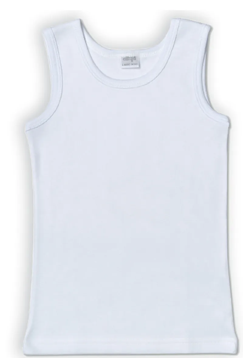 CANOTTIERA SPALLA LARGA IN COTONE INTERLOCK ELLEPI. TG: 3A – 4A – 5A – 6A – 8A – 10A – 12A – 14A. COLORE: BIANCO. Prezzo unitario, confezione da 3 pezzi