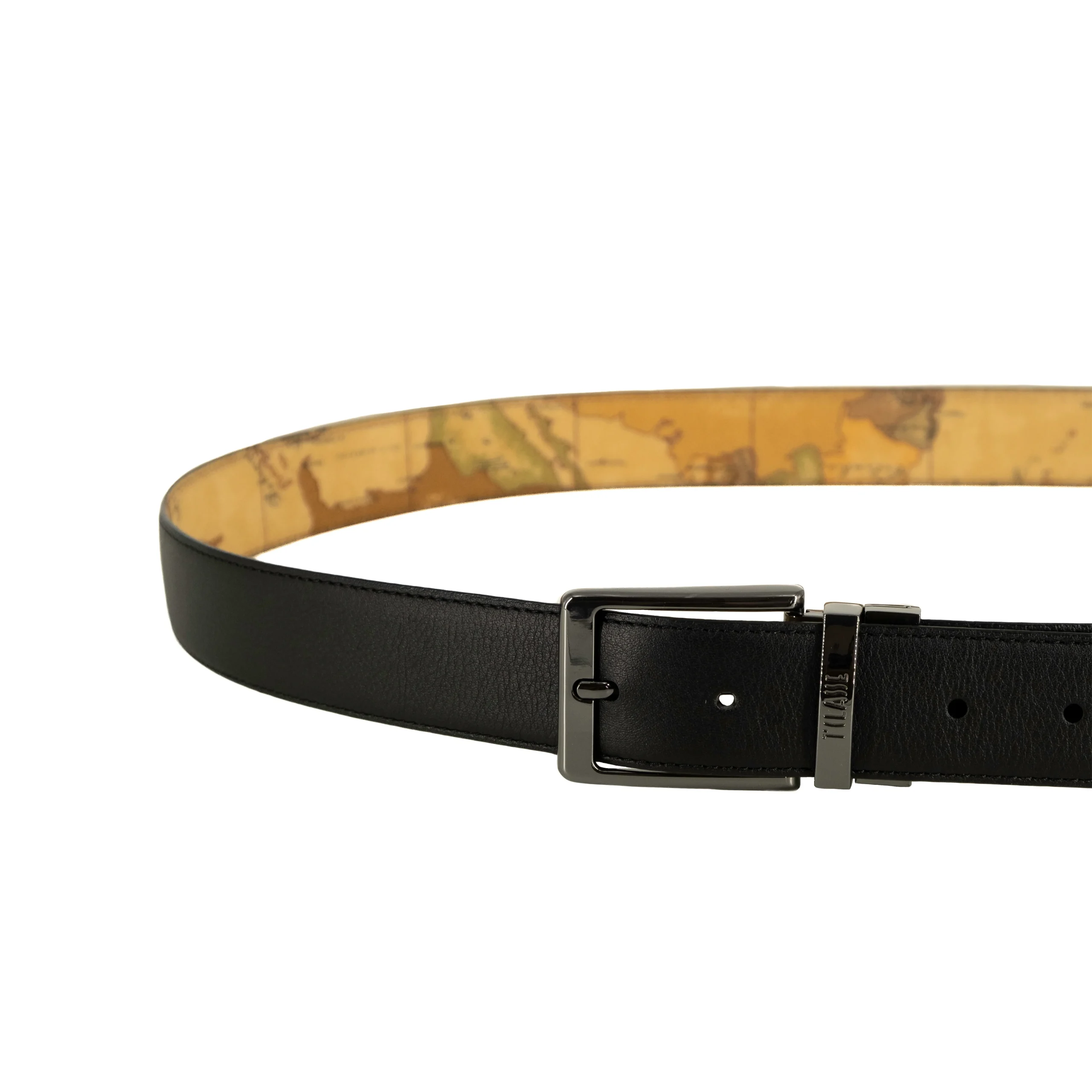 Cintura uomo Alviero Martini Prima Classe in pelle nera con retro in tessuto stampa Geo Dark che si caratterizza per la fibbia rettangolare logata con finiture colore canna di fucile. Misura 120 cm Composizione: 50%Bovino 22%PVC 15%CO 7