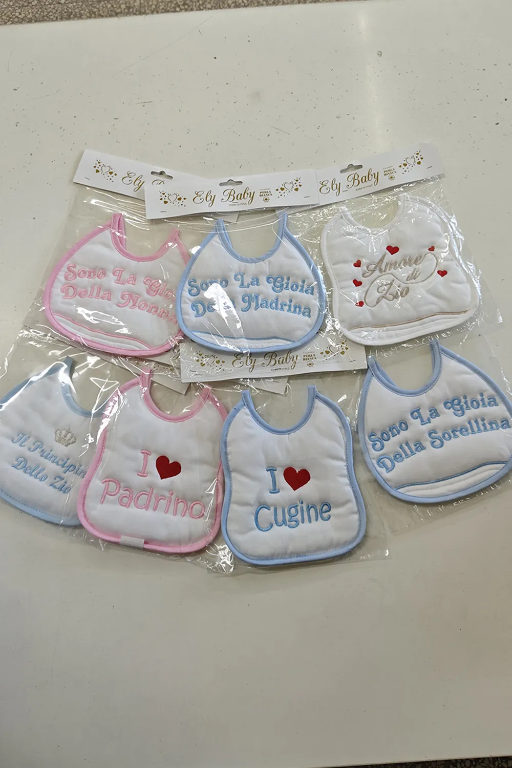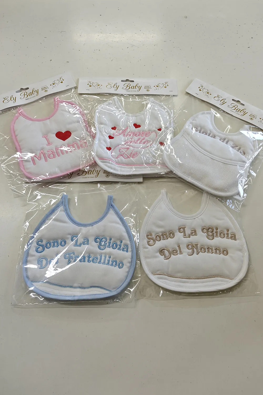 BAVAGLINI 100 % MADE IN ITALY IMBUSTATI SINGOLARMENTE. CUCITI A MANO IN 100 % COTONE. FRASI MAMMA,PAPA’,ZIO,ZIA,NONNO,NONNA,PADRINO,MADRINA ECC… COLORI : GIRL , BOY, NEUTRO. PREZZO UNITARIO: ASSORTIMENTO MIX DI 30 BAVAGLINI.