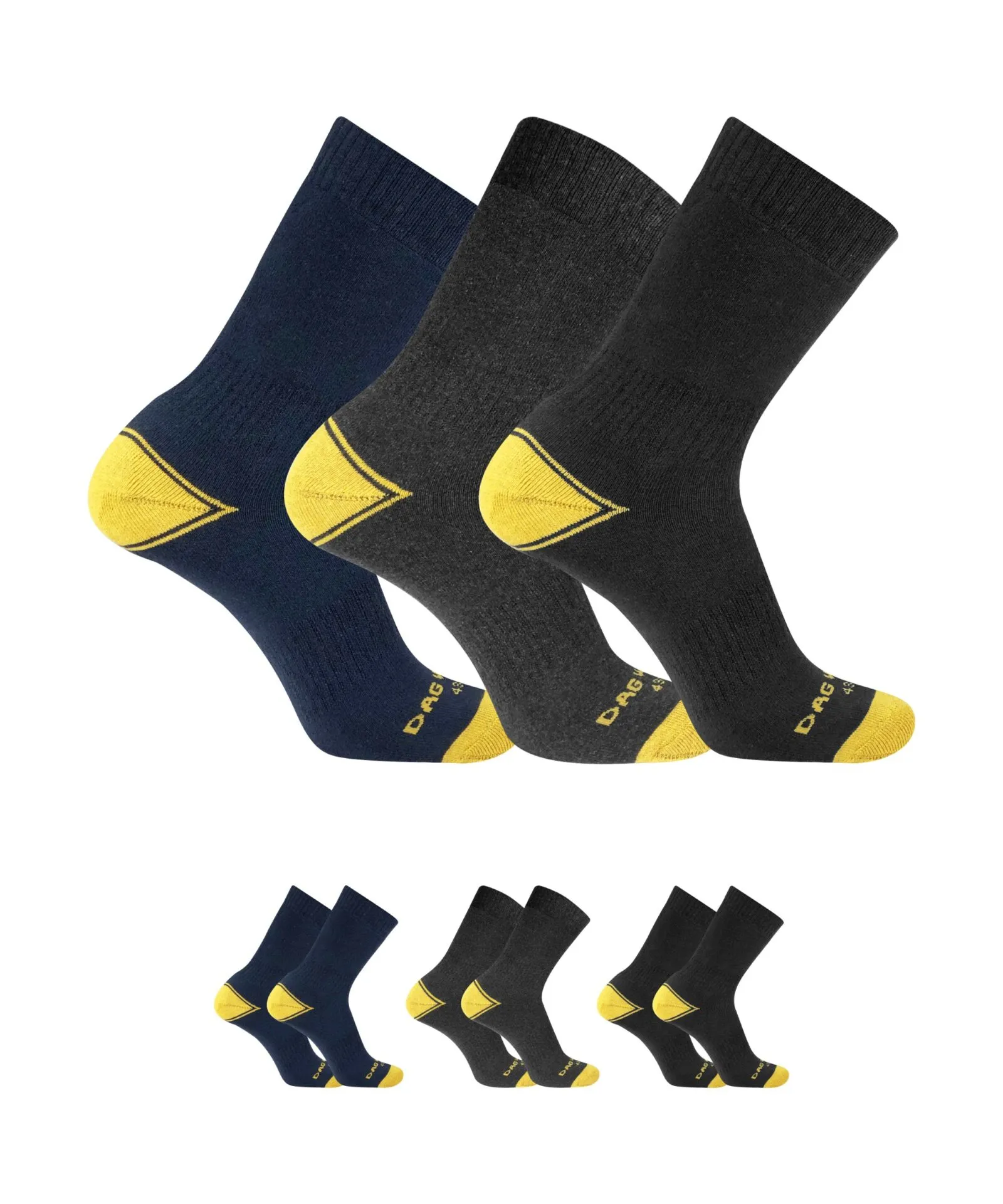 CALZE CORTE DA LAVORO A MARCHIO DAG WORK IN MORBIDO COTONE. FASCIA ELASTICA SU TIBIA E CAVIGLIA PER UNA MASSIMA ADERENZA E SICUREZZA IN TUTTI I MOVIMENTI. TG: 39/42 – 43/46 – 47/50. COLORE: FRANCESE. Confezione da 4 TRIPACK(12 PAIA)