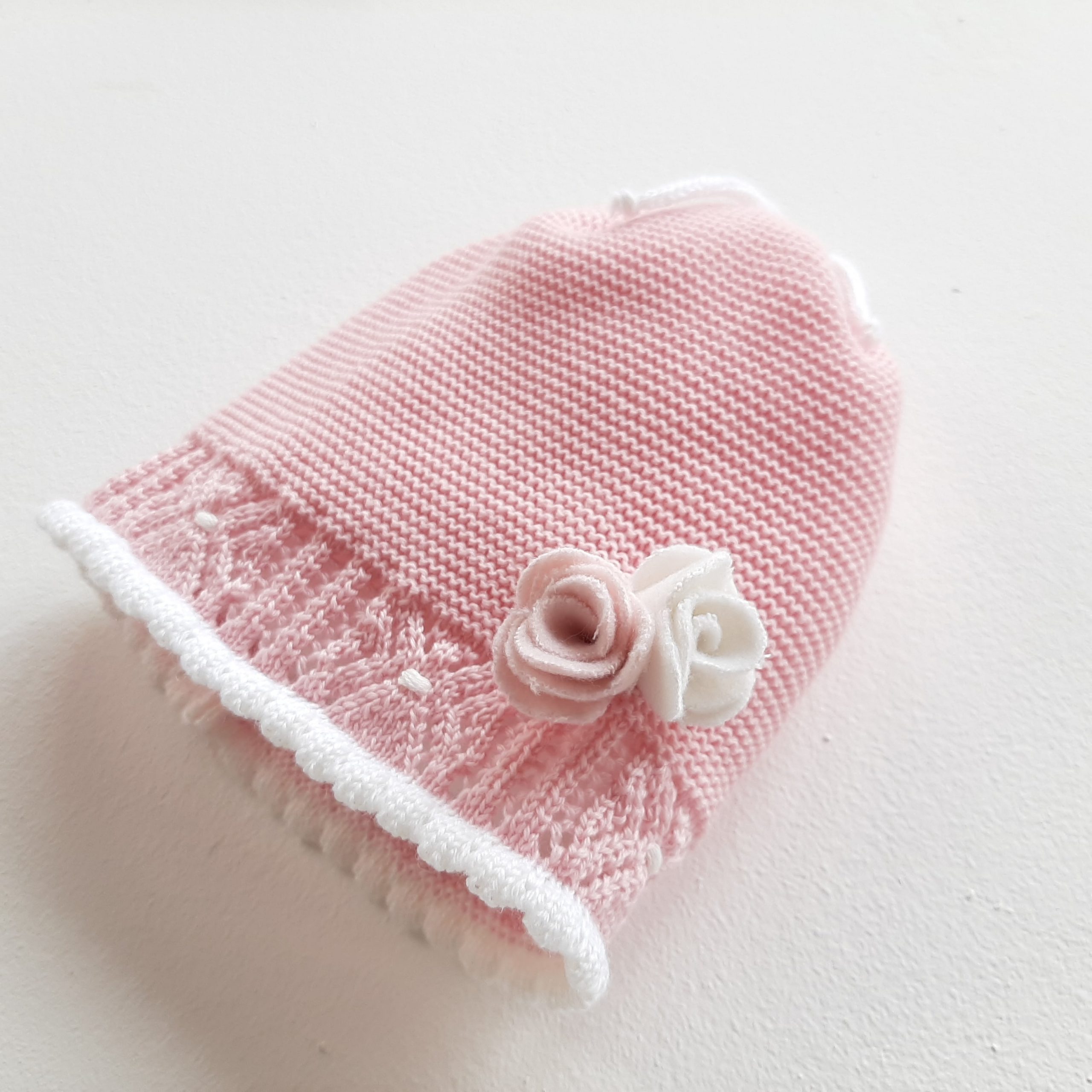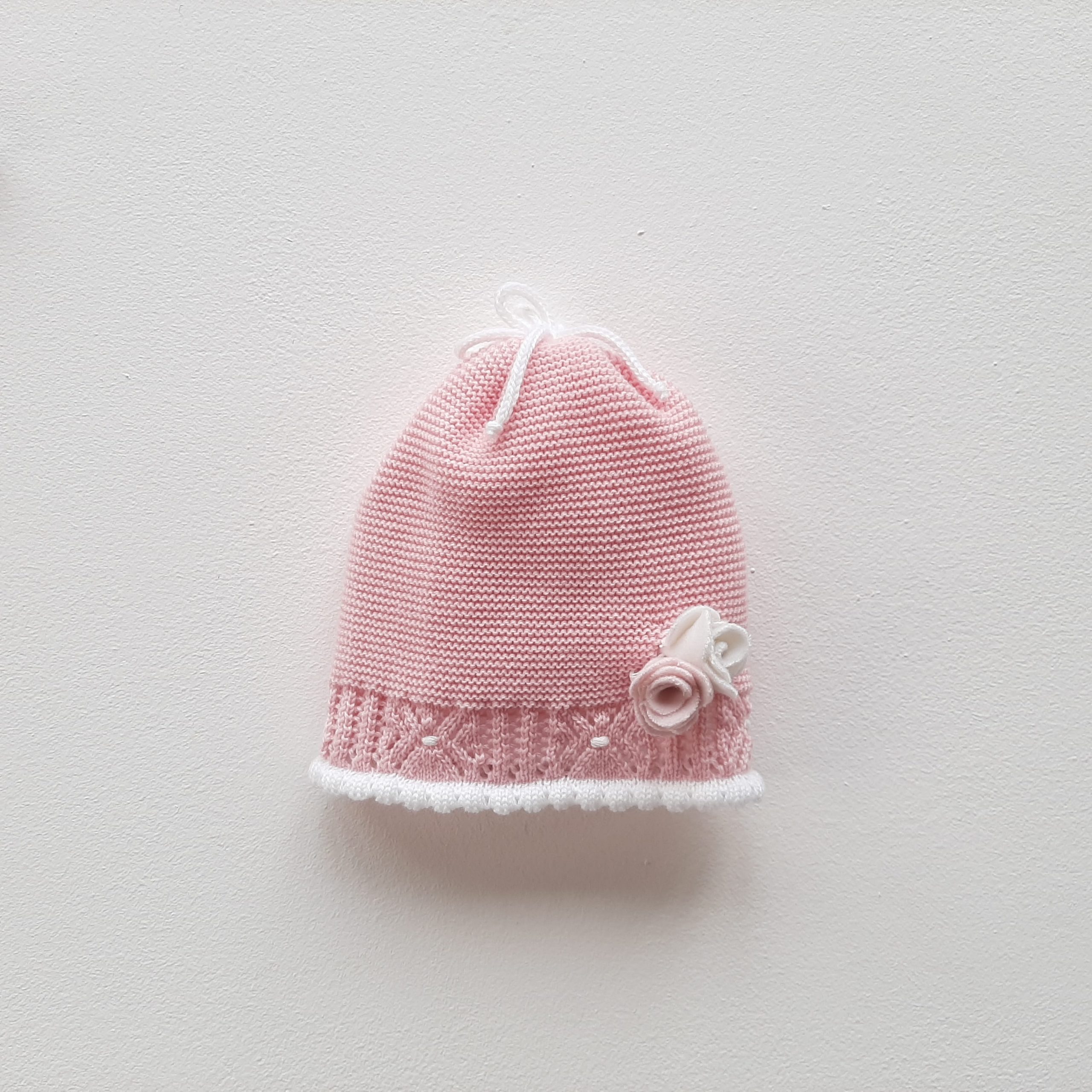 Cappellino neonata rosa forte in 100% lana merino con una greca decorativa traforata tono su tono e orlini smerlati latte, con bouquet di fiori realizzati a mano con tessuto pannolenci e pois ricamati a mano. Per una piccolina che non passa inosservata! 100% lana merino extra-fine Ricamato a mano Lavaggio a mano a basse temperature. Consulta la sezione Cura dei capi ❤️ Made in Italy