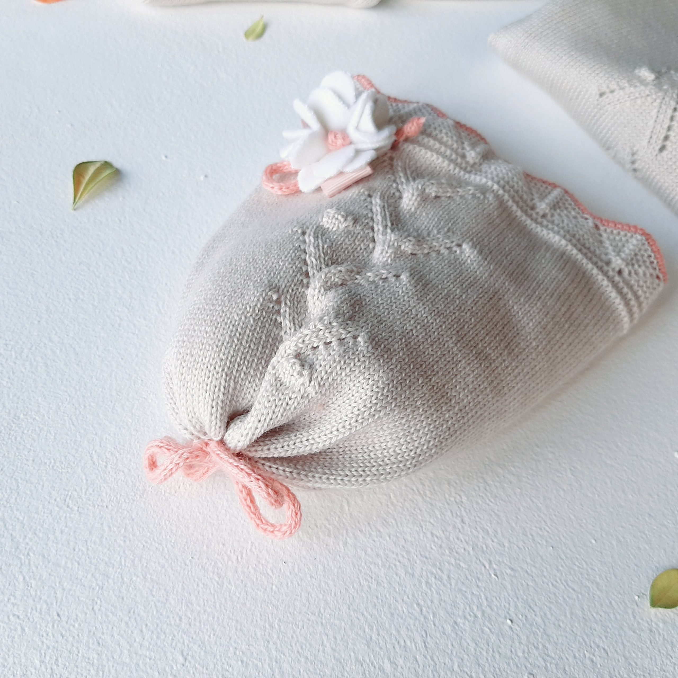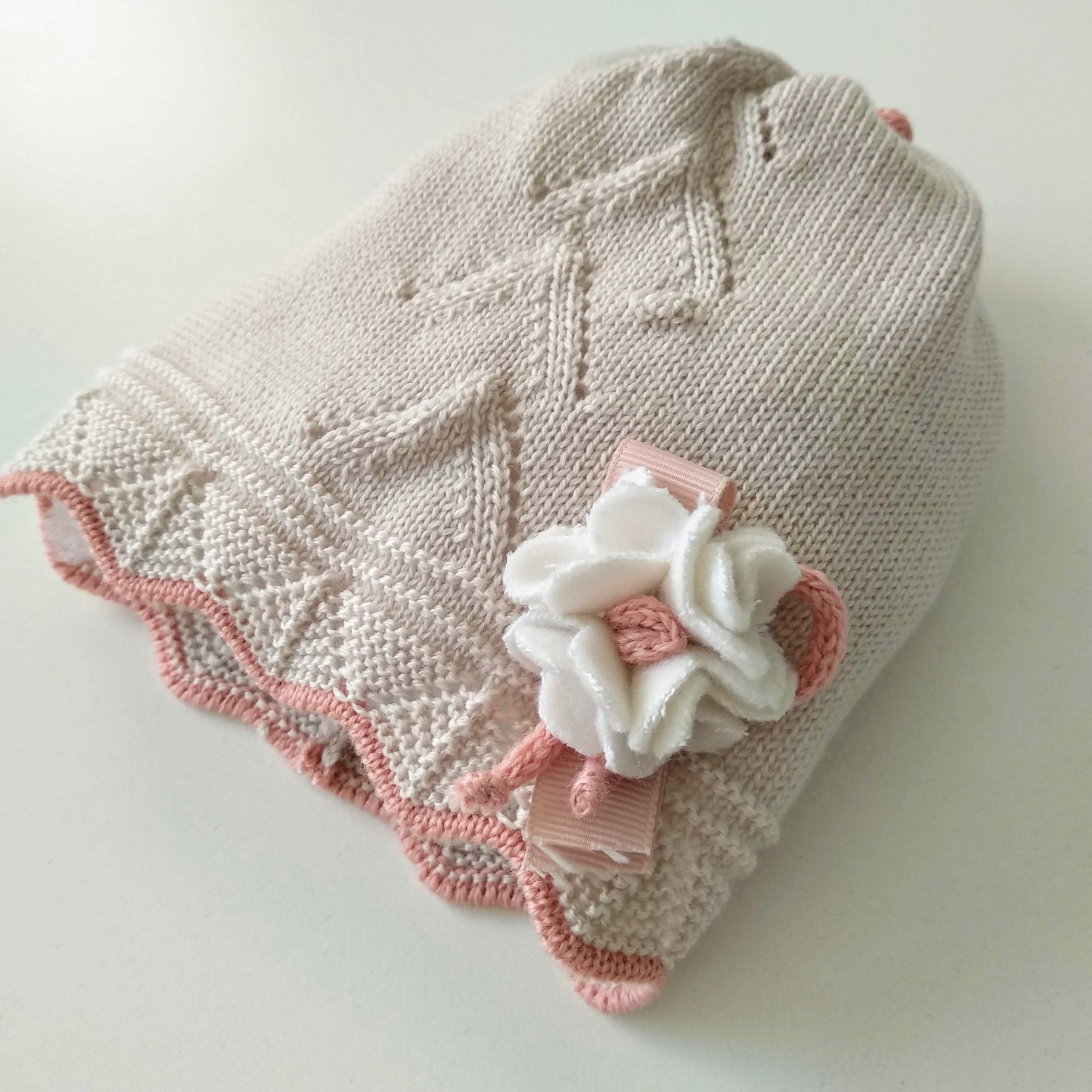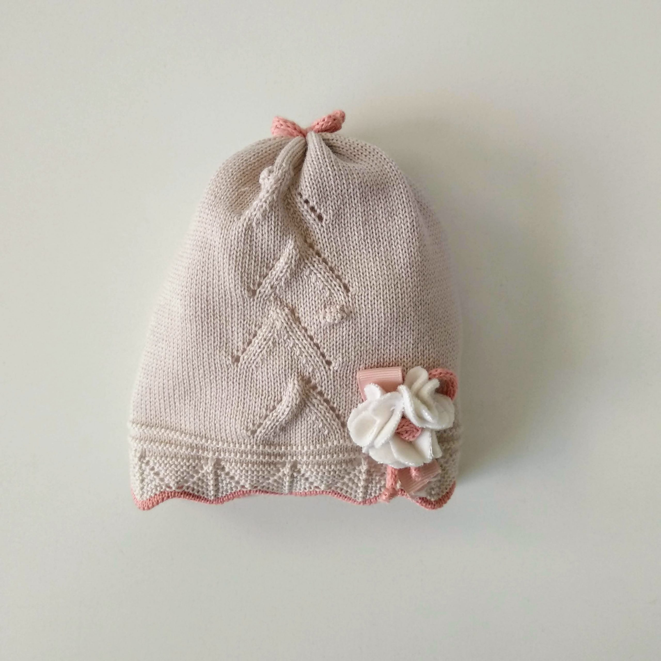 Sfizioso cappellino neonata color beige in 100% lana merino con una greca decorativa traforata tono su tono e orlini rosa antico, ripresa da lavorazioni simmetriche decorate da un fiore laterale realizzato a mano con pannolenci e nastrini. Un cappellino che insegna a essere originali ❤️ 100% lana merino extra-fine Applicazioni realizzate e cucite a mano Lavaggio a mano a basse temperature. Consulta la sezione Cura dei capi ❤️ Made in Italy