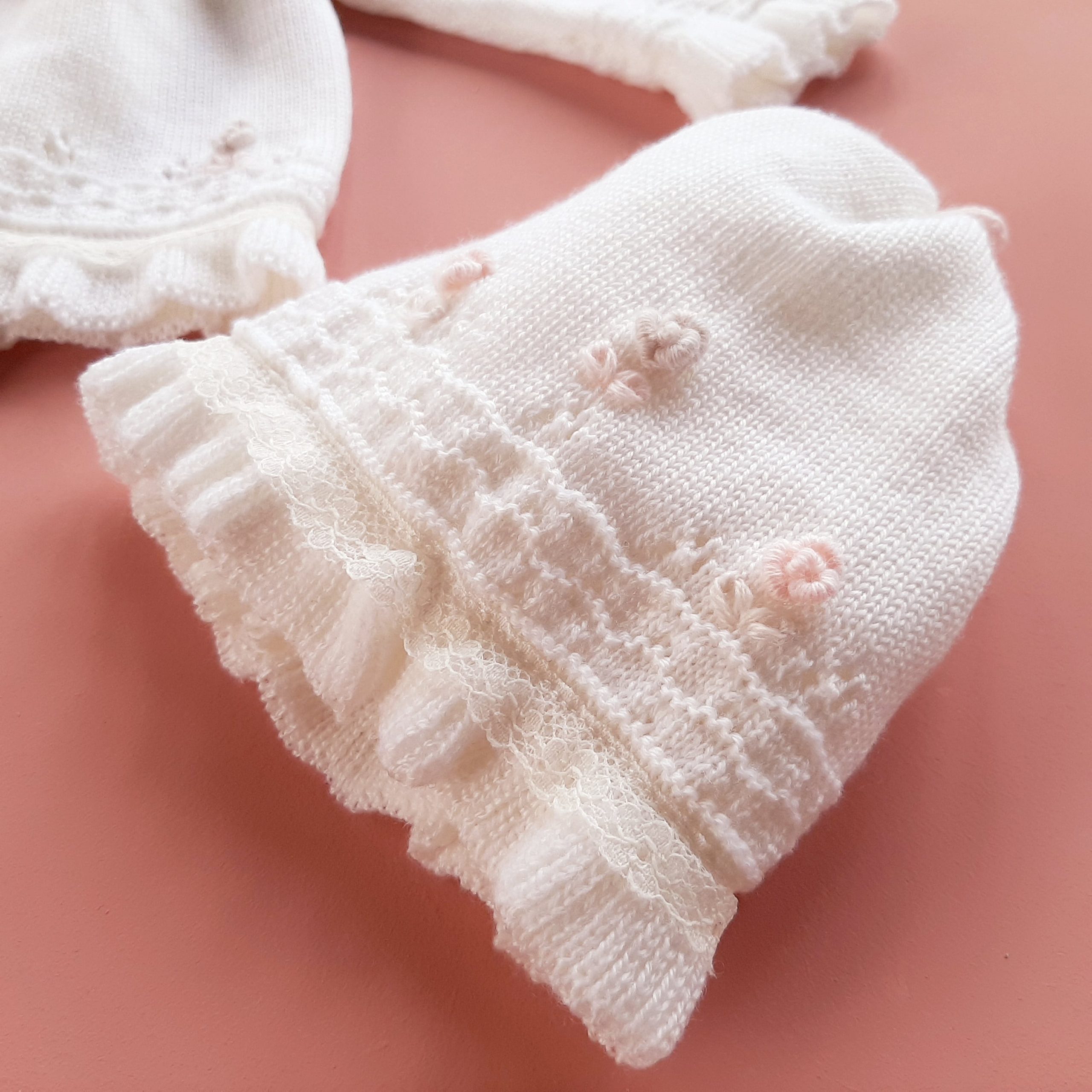 Delicato cappellino neonata color latte in 100% lana merino con una greca decorativa traforata tono su tono, decorata da piccoli fiorellini rosa/beige ricamati a mano. Maglia inglese sui bordi e merletto in cotone a trama floreale. Un cappellino che insegna a sognare ❤️ 100% lana merino extra-fine Ricamato a mano Lavaggio a mano a basse temperature. Consulta la sezione Cura dei capi ❤️ Made in Italy