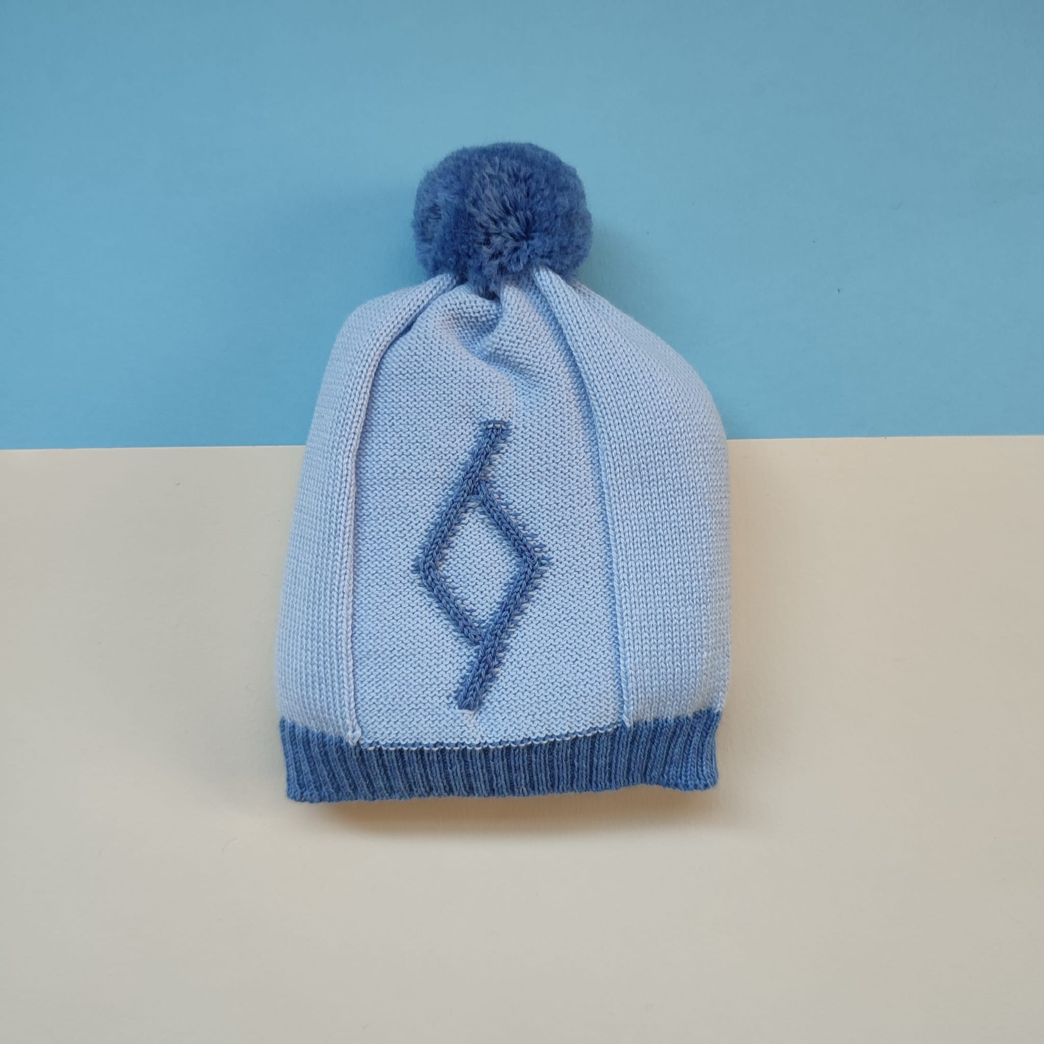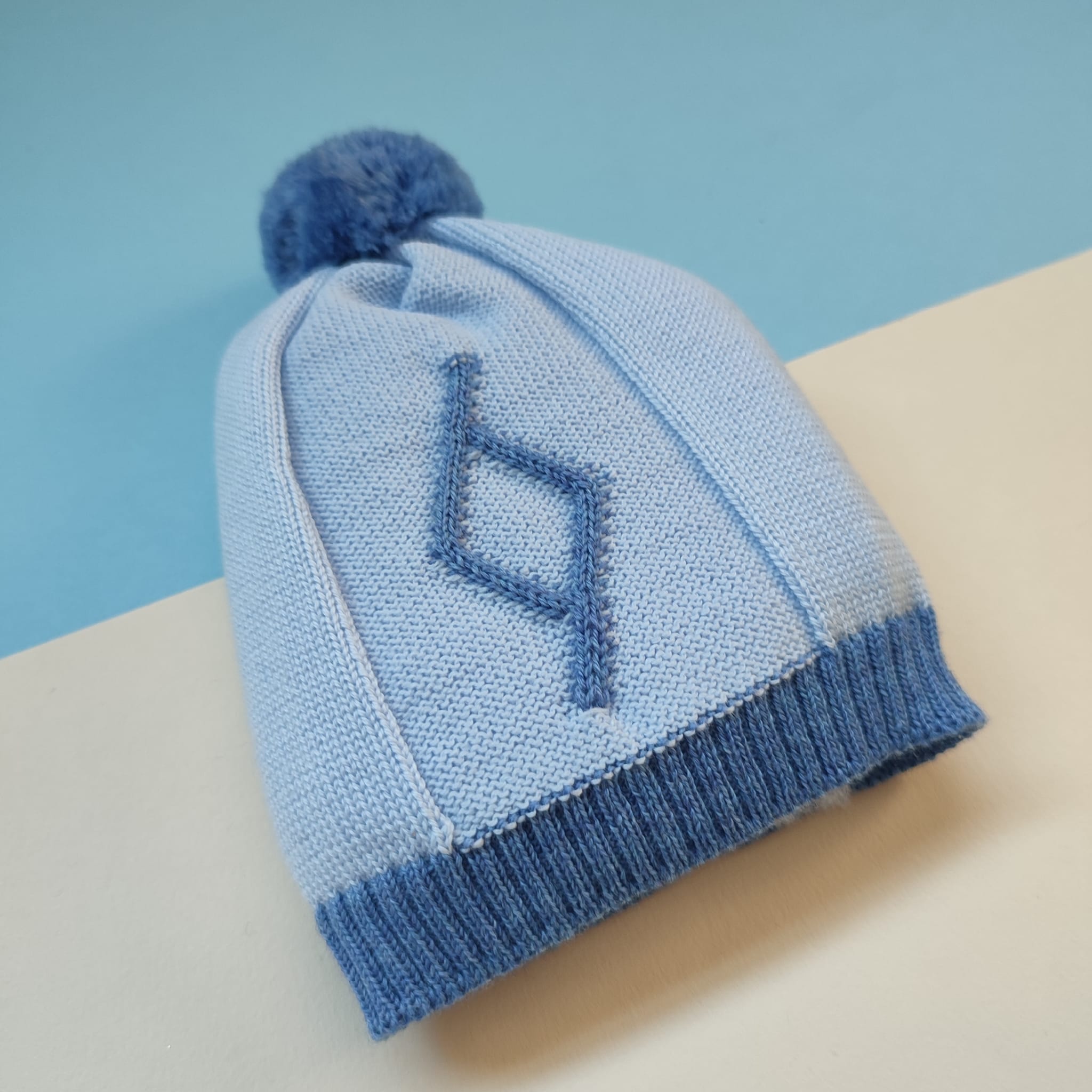 Cappellino neonato in 100% lana merino color cielo melange, con design di rombi color avio realizzati ad intarsio e adornati da un tenero pom pom in lana. Caldo e giocoso! 100% lana merino extra-fine Pom pom realizzati a mano Lavaggio a mano a basse temperature. Consulta la sezione Cura dei capi ❤️ Made in Italy