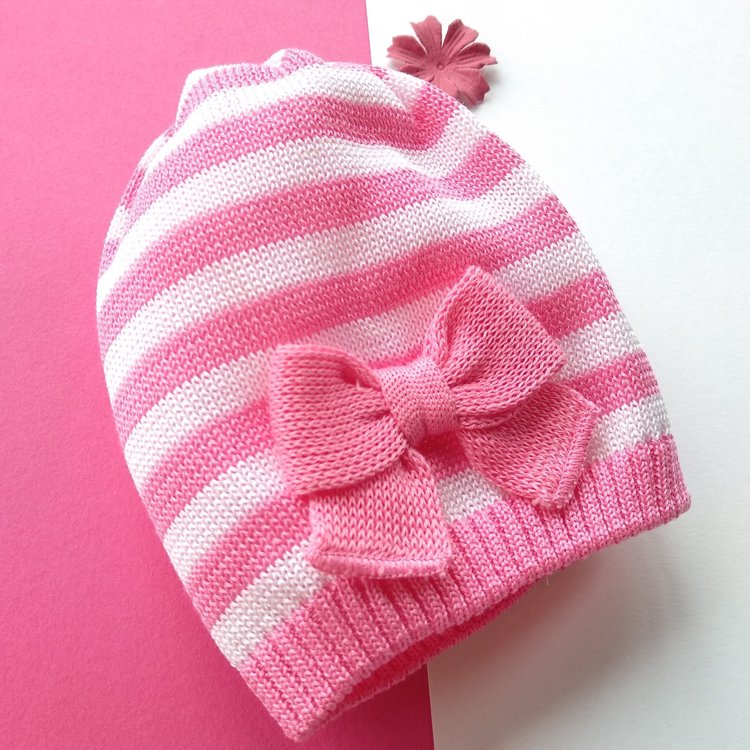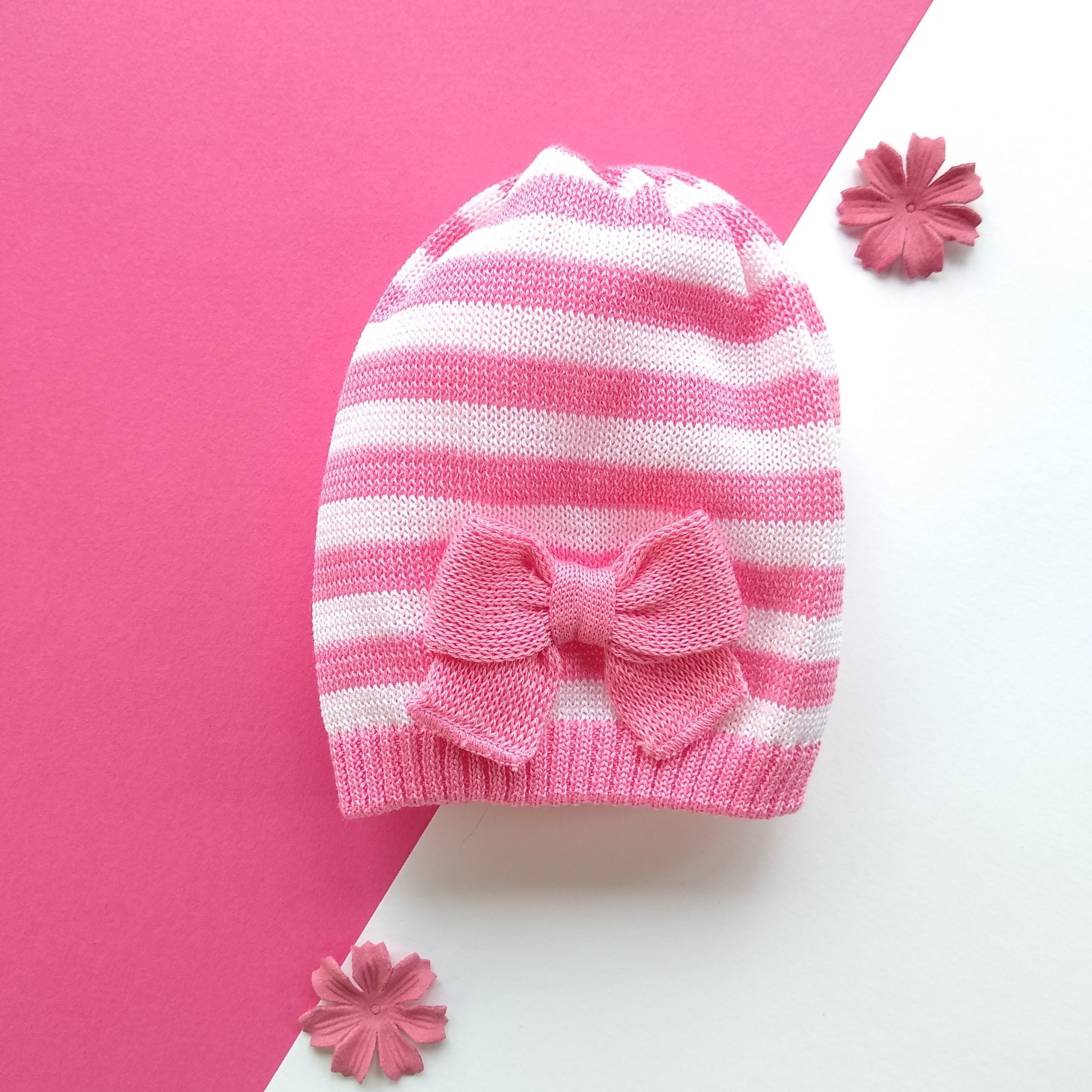 Fresco e delicato cappellino a righe bianco ortensia in filo di scozia extrafine con fiocchetto realizzato a mano. 100% cotone Ricamato a mano Lavaggio a mano a basse temperature Made in Italy