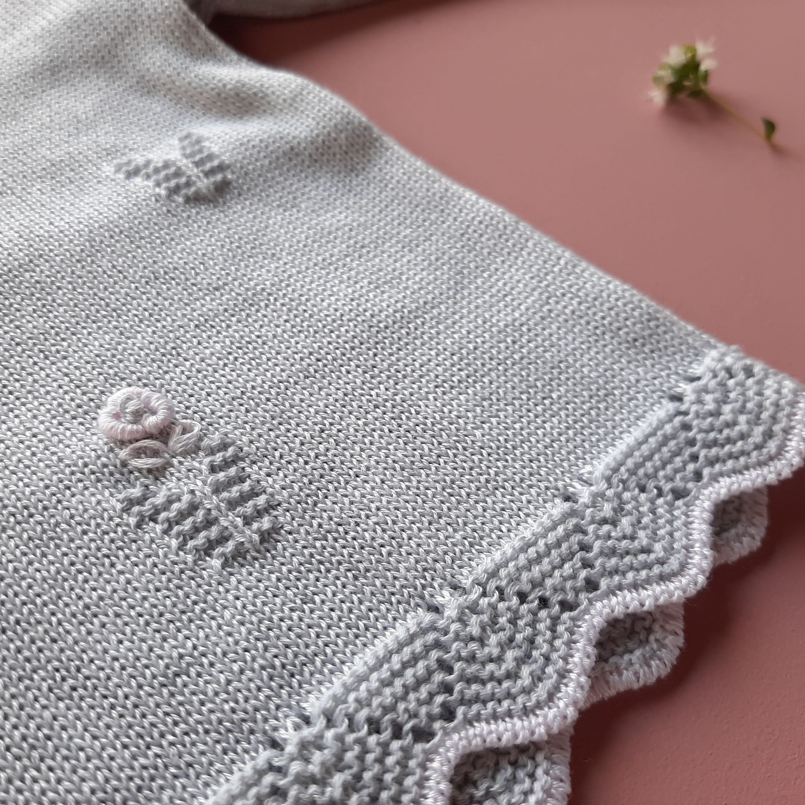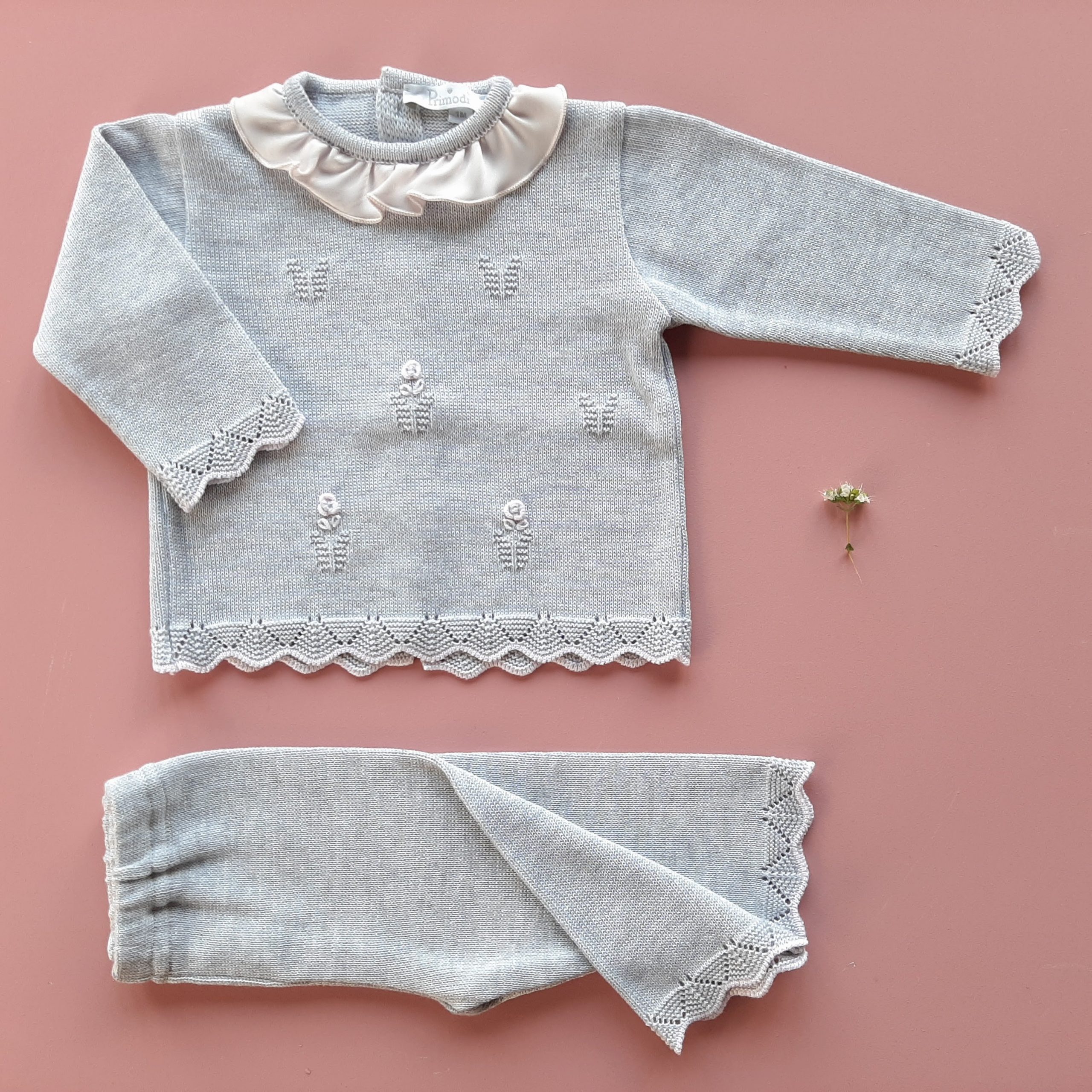 Delicato completino due pezzi in filo di scozia extrafine, con delicate roselline ricamate a mano e colletto in leggero tessuto georgette color rosa. Romantica lavorazione della maglia a forma di foglia e bordini con greca. 100% cotone Ricamato a mano Lavaggio a mano a basse temperature Made in Italy