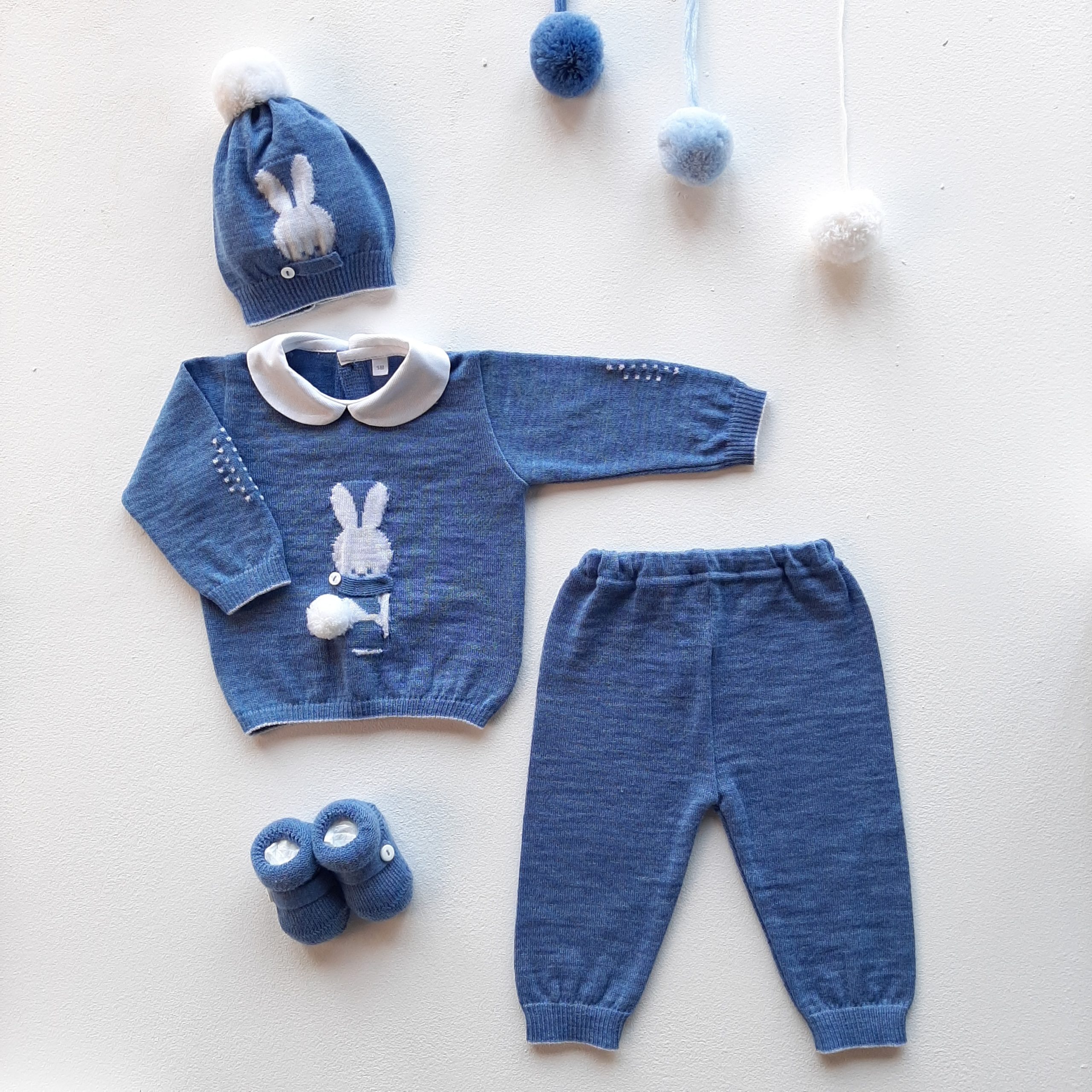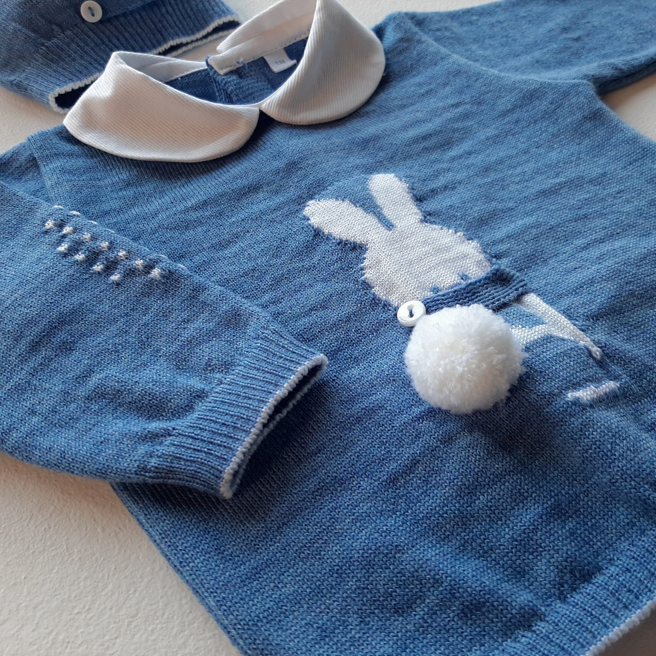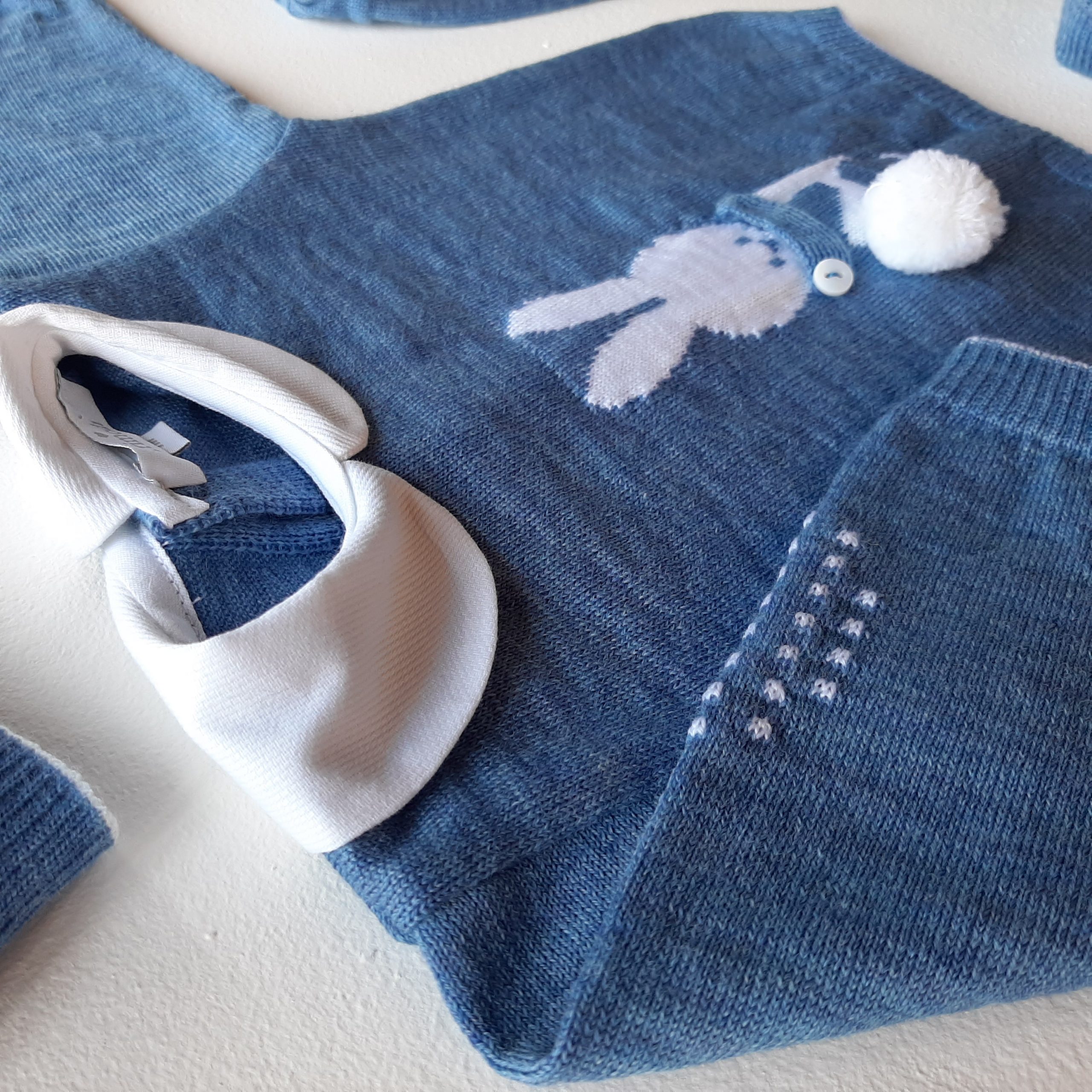 Dolce completino neonato in 100% lana merino color avio con design di coniglietto ad intarsio color latte adornato da una sciarpetta con bottoncino e pom pom in rilievo. Colletto modello peter pan. Lavorazione a quadratini latte sulle maniche. La tenerezza a portata di mano! 🐰 Caratteristiche 100% lana merino extra-fine Applicazioni realizzate e cucite a mano Lavaggio a mano a basse temperature. Consulta la sezione Cura dei capi ❤️ Made in Italy