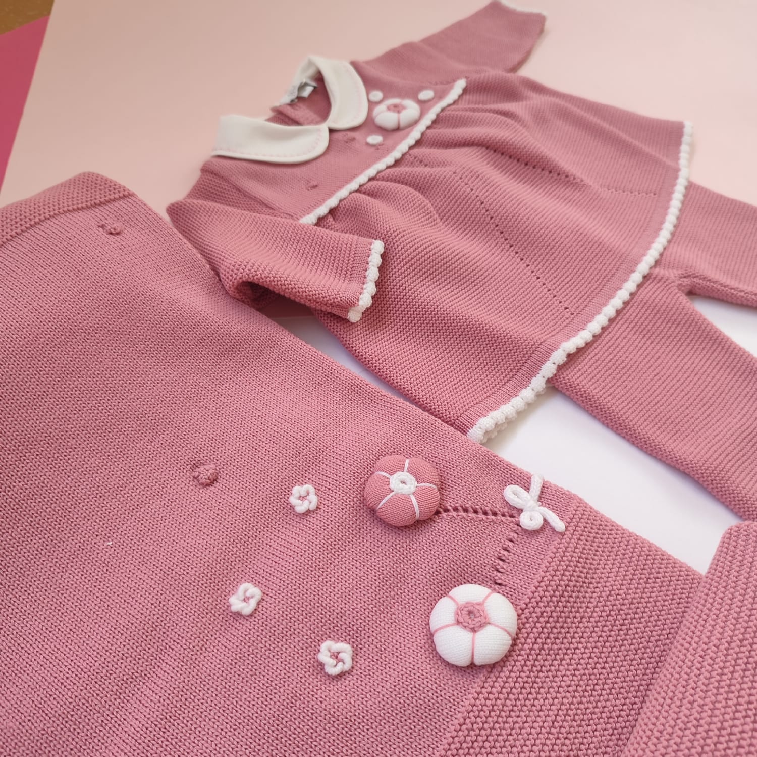 Completino in 100% lana merino rosa antico con profili latte, con fiore bon bon imbottito e realizzato a mano e piccoli fiorellini ricamati🌸 Caratteristiche Ricamata a mano 100% lana merino Lavaggio a mano a basse temperature. Consulta la sezione Cura dei capi ❤️ Made in Italy