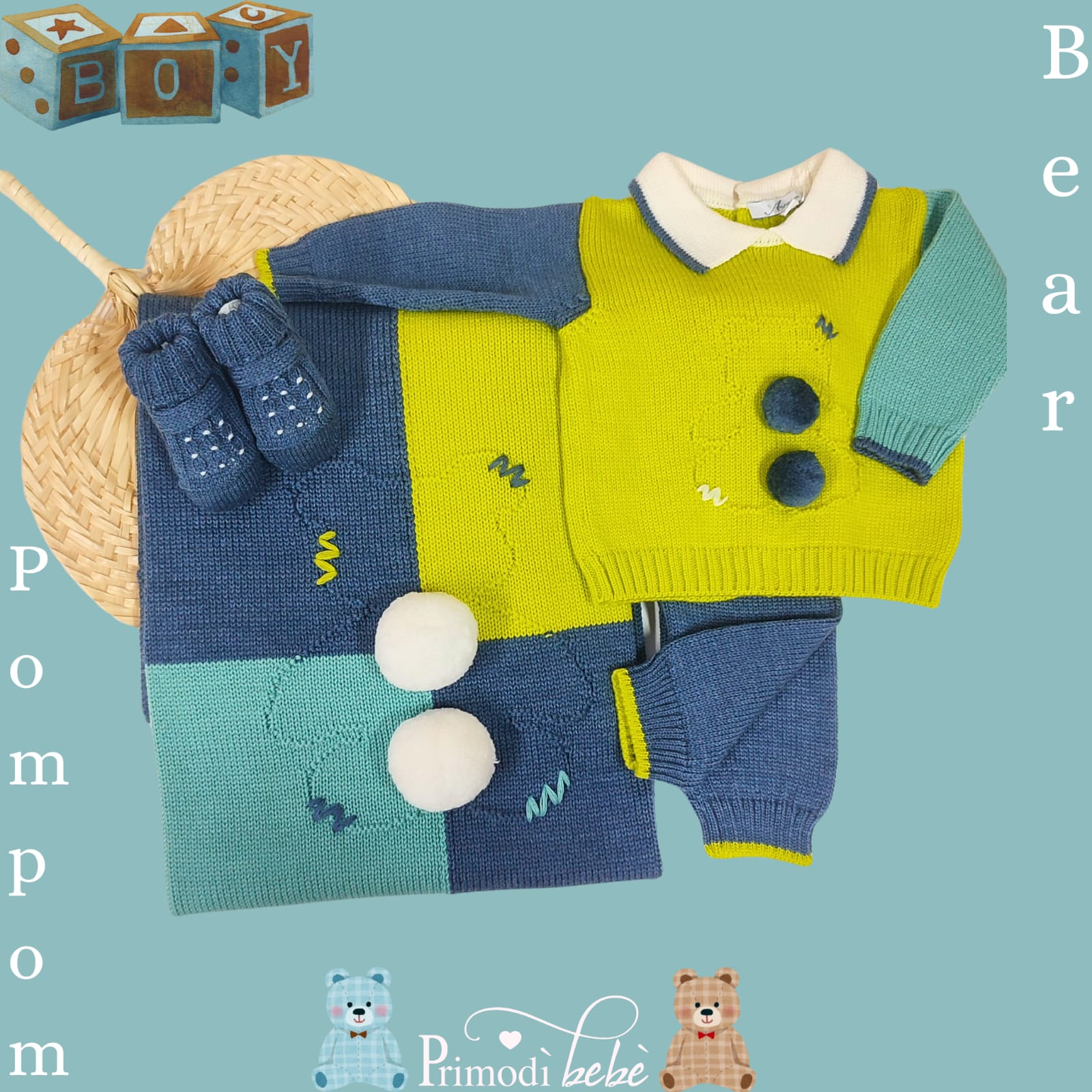 🍁NUOVA COLLEZIONE AI 2024 – Linea Aurora ❄️ Completino nascita per neonato a tema Orsetto, in 100% pura lana merino, con design in quadricromia, pom pom realizzati a mano e ricamini sul corpo dell’orsetto. Palette blue melange, acqua marina, senape. Un completino dolcissimo e morbidissimo, perfetto sia come regalo che assieme a tutto il set nascita 🧸 Consulta la nostra Guida alle taglie per tutte le info!🪡 100% lana merino Lavaggio a mano a basse temperature Made in Italy