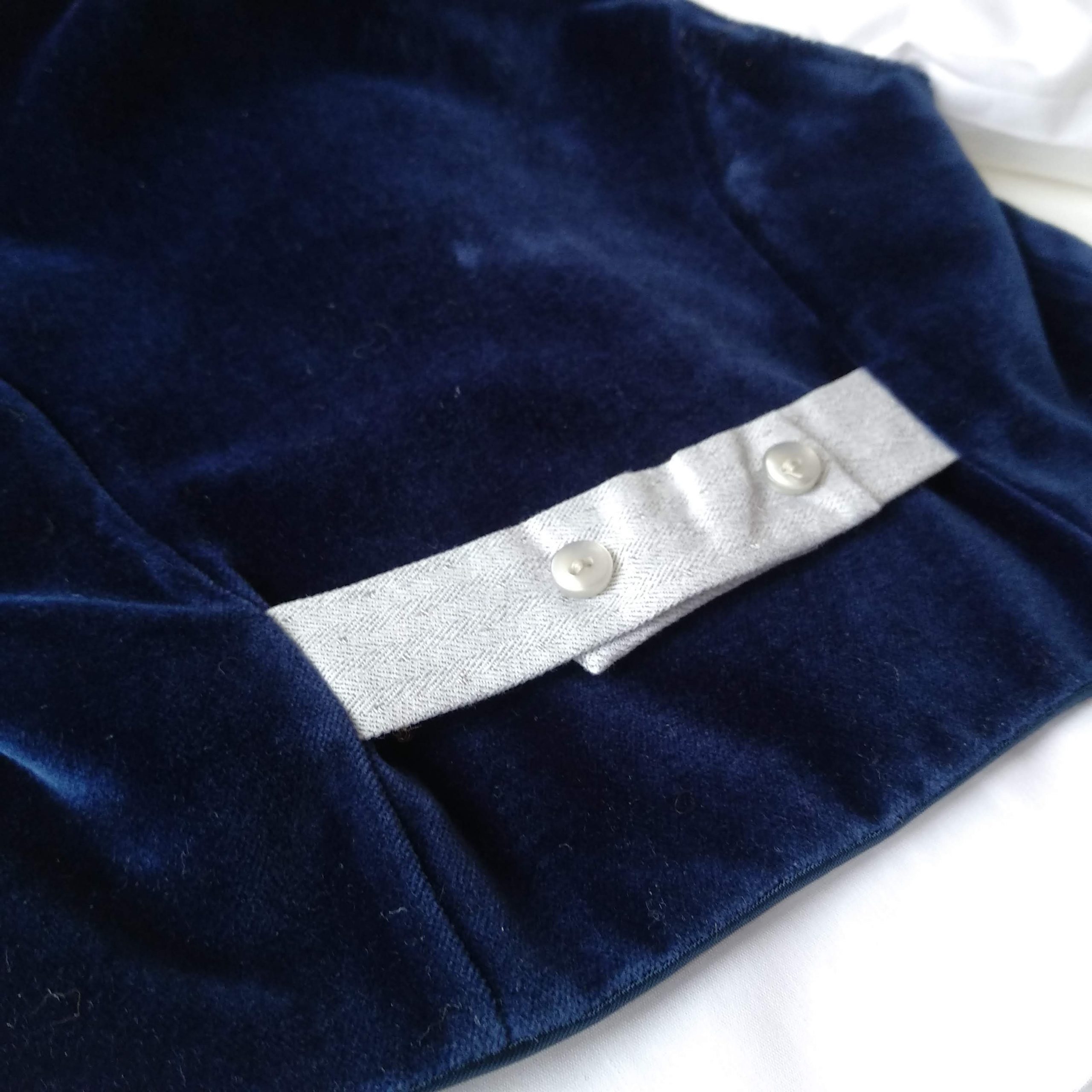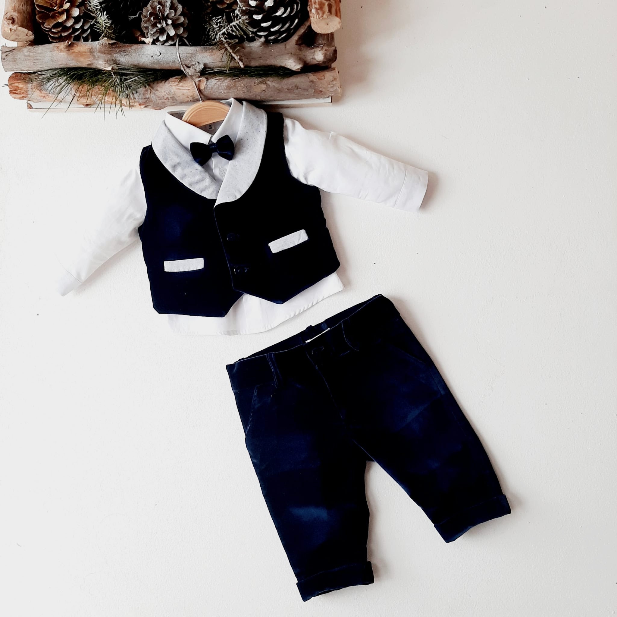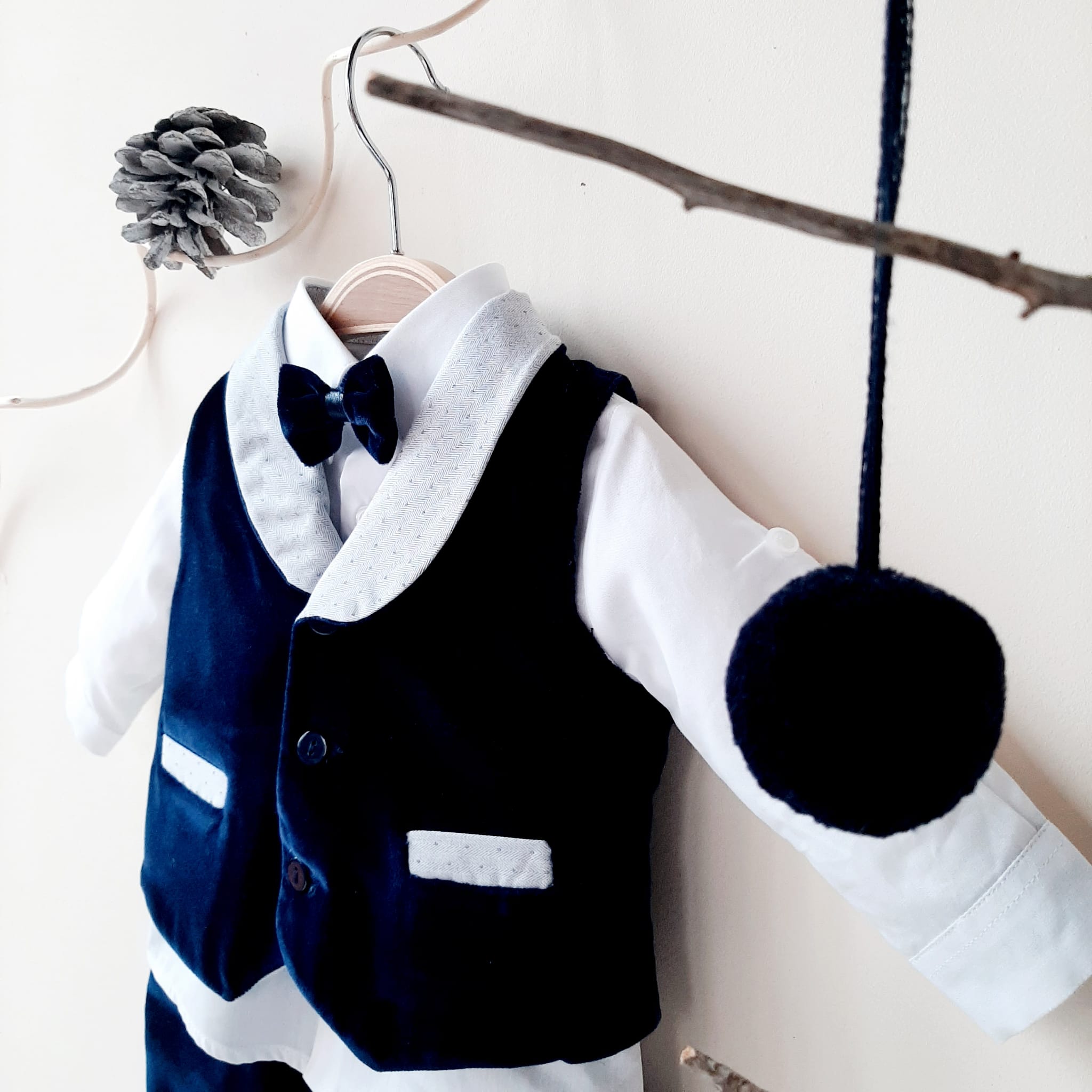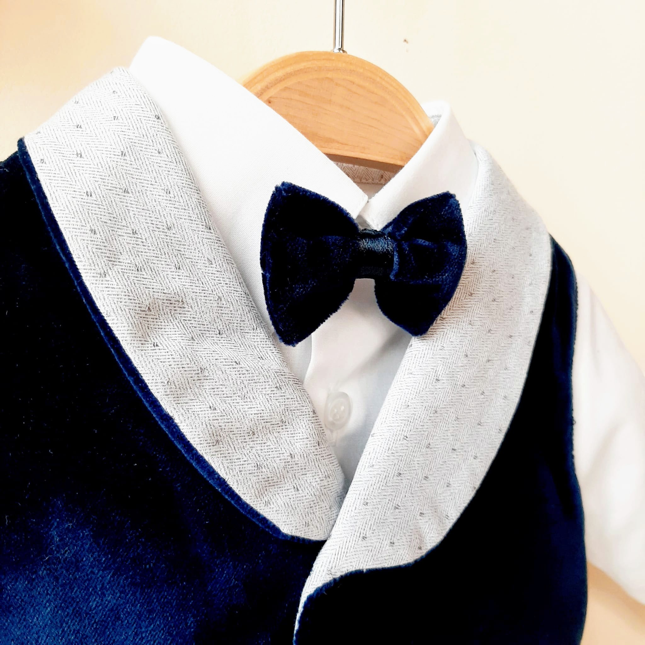 Elegante abitino per lui in morbidissimo velluto blu. Gilet con bavero in tessuto grigio chiaro microfantasia e finte tasche. Camicia bianca in cotone con pistagna dello stesso tessuto. Papillon e pantaloncino interamente in velluto. Non vi sembra meraviglioso per il suo primo Natale? ❤️ 🎄 Caratteristiche 100% cotone e velluto Lavaggio a mano a basse temperature. Consulta la sezione Cura dei capi ❤️ Made in Italy