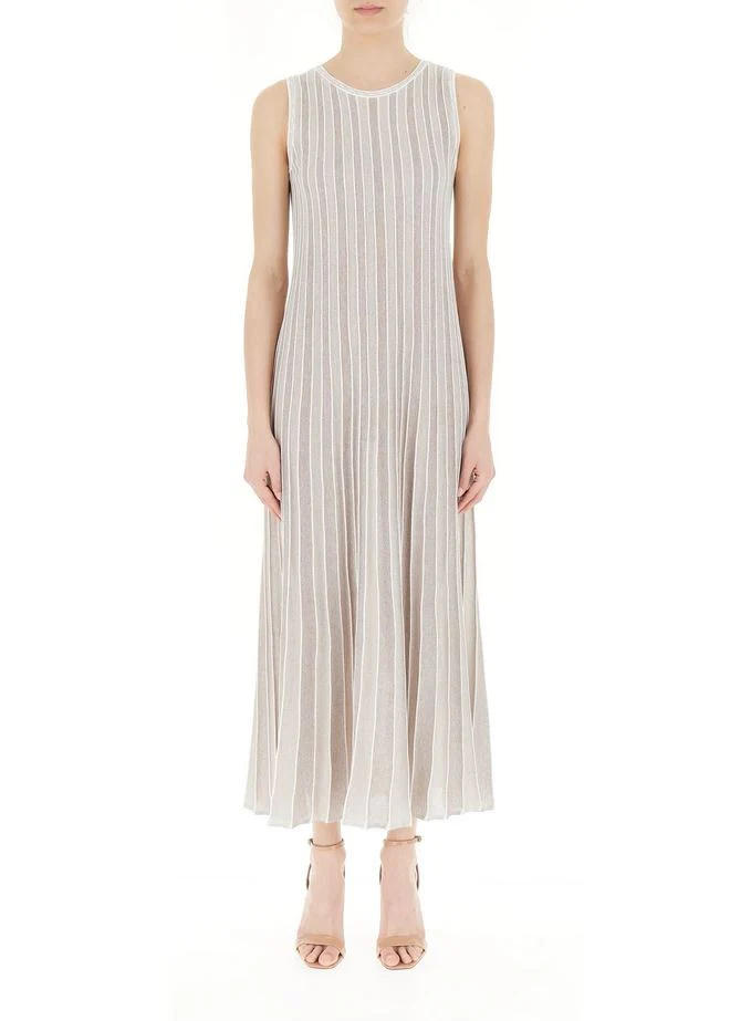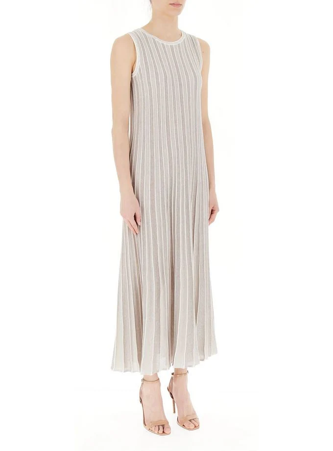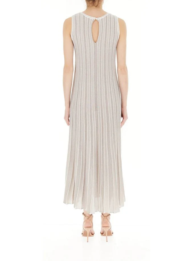 Abito lungo smanicato di D.EXTERIOR in misto viscosa e lurex, caratterizzato da lavorazione a plissè e chiusura a goccia sul retro. Made in Italy. Codice: 58052 Colore: LINO