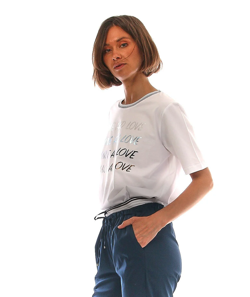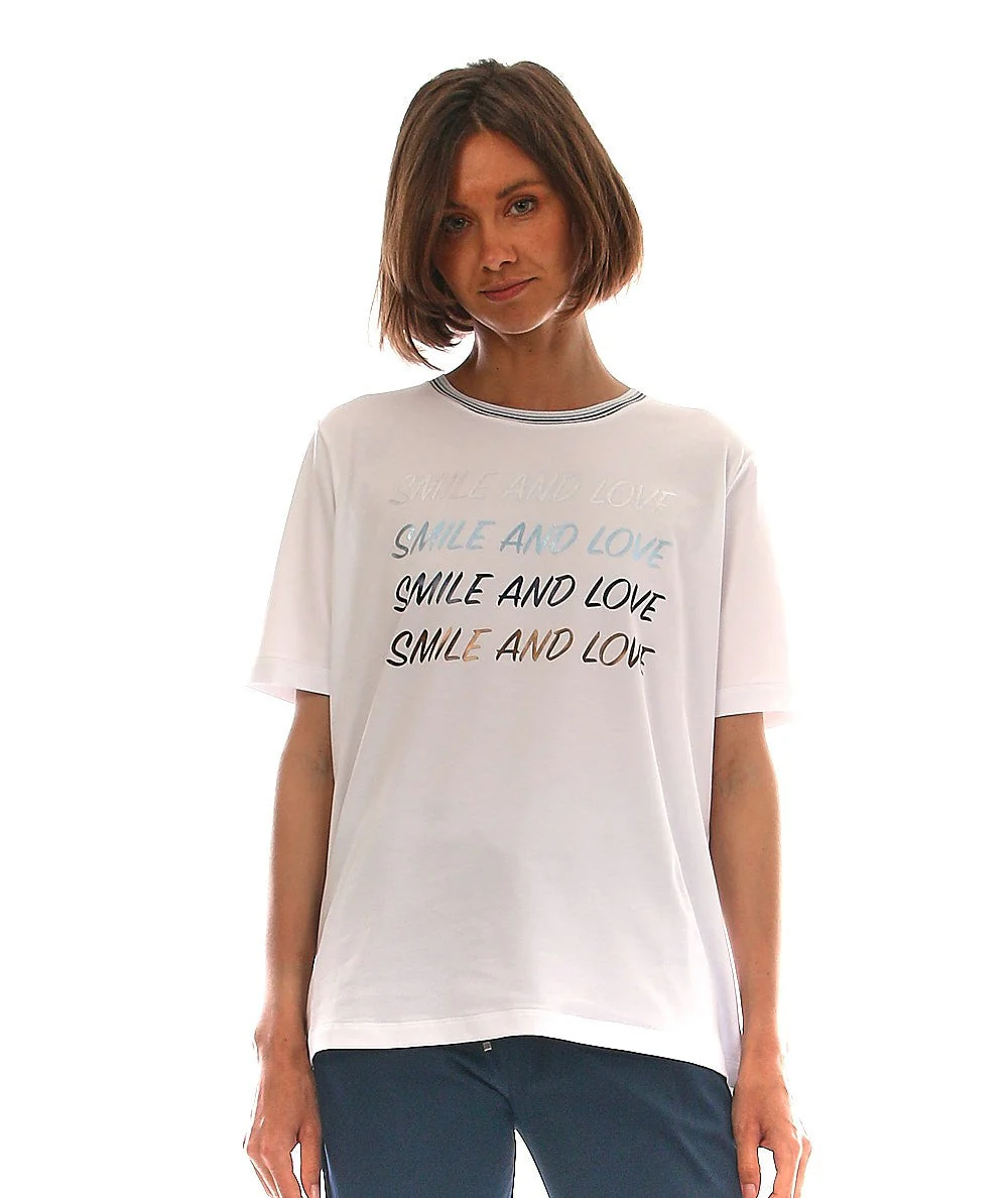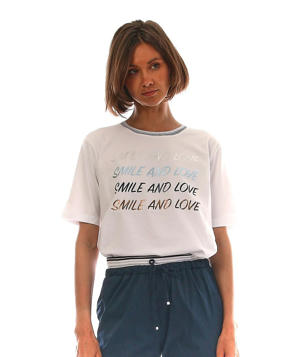 T-shirt di D. EXTERIOR con stampa sul davanti. Codice: 54727. Colore: BIANCO MADE IN ITALY T-shirt di D.EXTERIORStampa “smile and love” sul davanti.Dettaglio a righe sul colletto.Girocollo.Maniche corte.Leggermente over. MADE IN ITALY MODELLO: 54727 COLORE: BIANCO