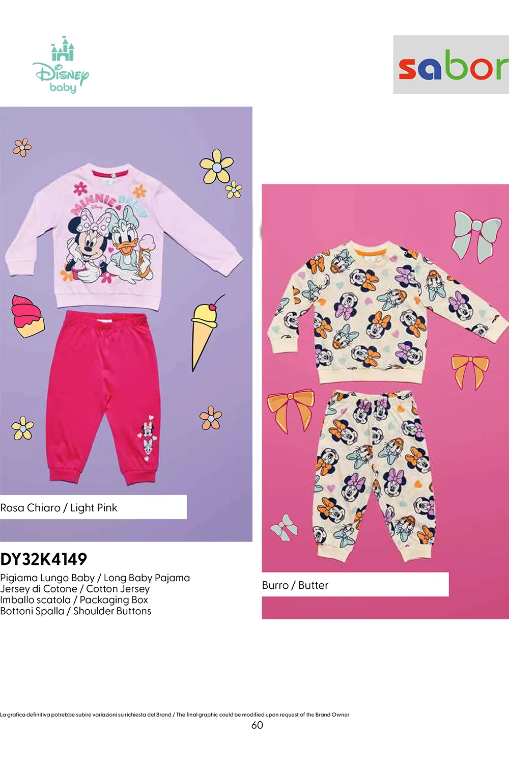 SABOR PIGIAMA BABY GIRL PERSONAGGI DISNEY IN 100% COTONE. TG: 12MESI / 18 MESI / 24MESI / 30MESI. COLORE: ROSA CHIARO – BURRO. BAULETTO DA 16 PEZZI: 2PZ 12M/ROSA CHIARO; 2PZ 18M/ROSA CHIARO; 2PZ 24M/ROSA CHIARO; 2PZ 30M/ROSA CHIARO; 2PZ 12M/BURRO; 2PZ 18M/BURRO; 2PZ 24M/BURRO; 2PZ 30M/BURRO;