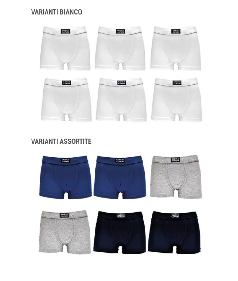 BOXER KIDS/JUNIOR ELASTICO INTERNO IN COTONE BIELASTICO COVERI. TG: 3/4 – 5/6 – 7/8 – 9/10 – 11/12 – 13/14 – 15/16. COLORE: BIANCO – ASSORTITO (2PZ BLU; 2PZ COBALTO; 2PZ GRIGIO CHIARO MELANGE). Prezzo unitario, confezione da 6 pezzi