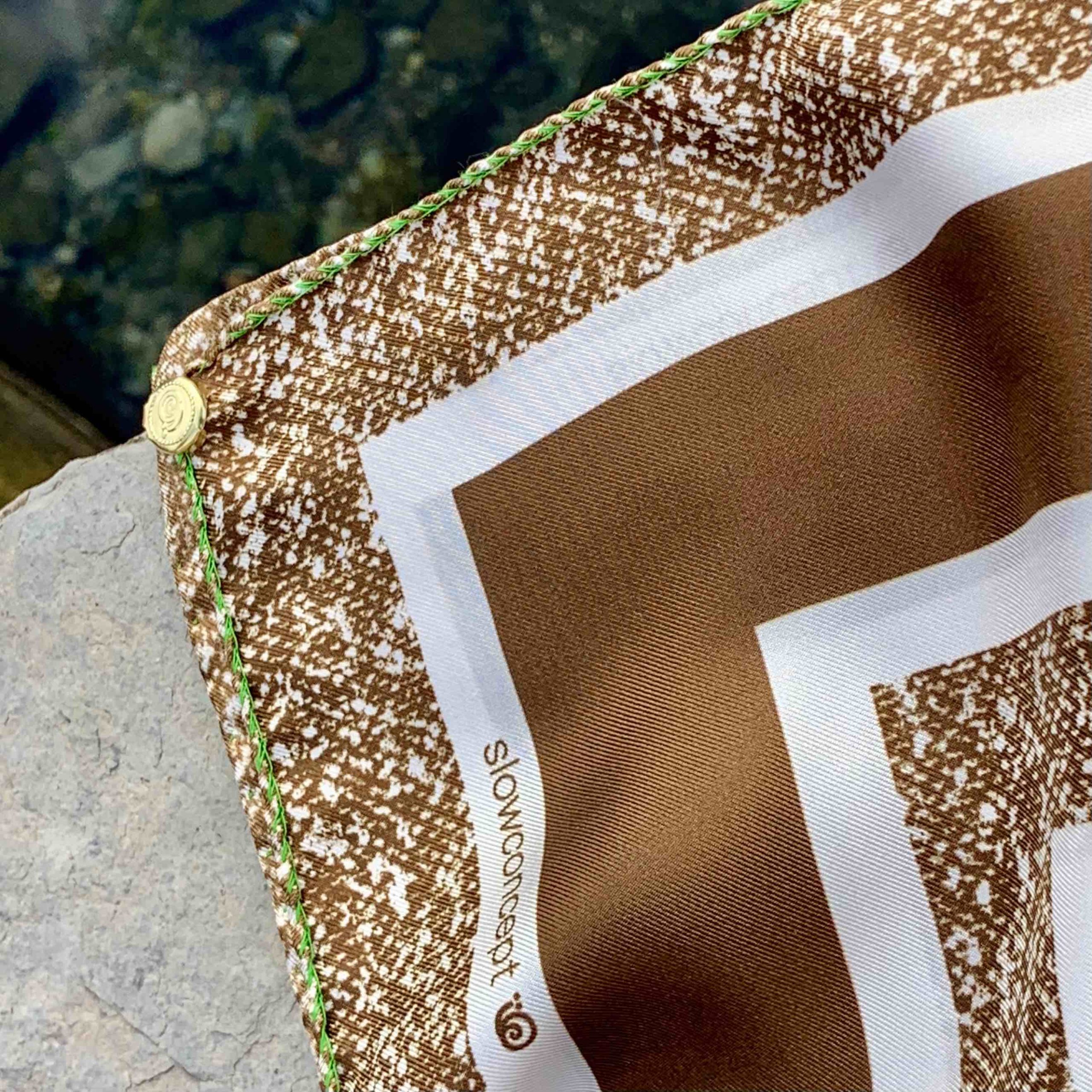 Foulard stampato Made in Italy 100% seta, disegno geometrico con bordo texture confezione orlo francese verde a contrasto.
