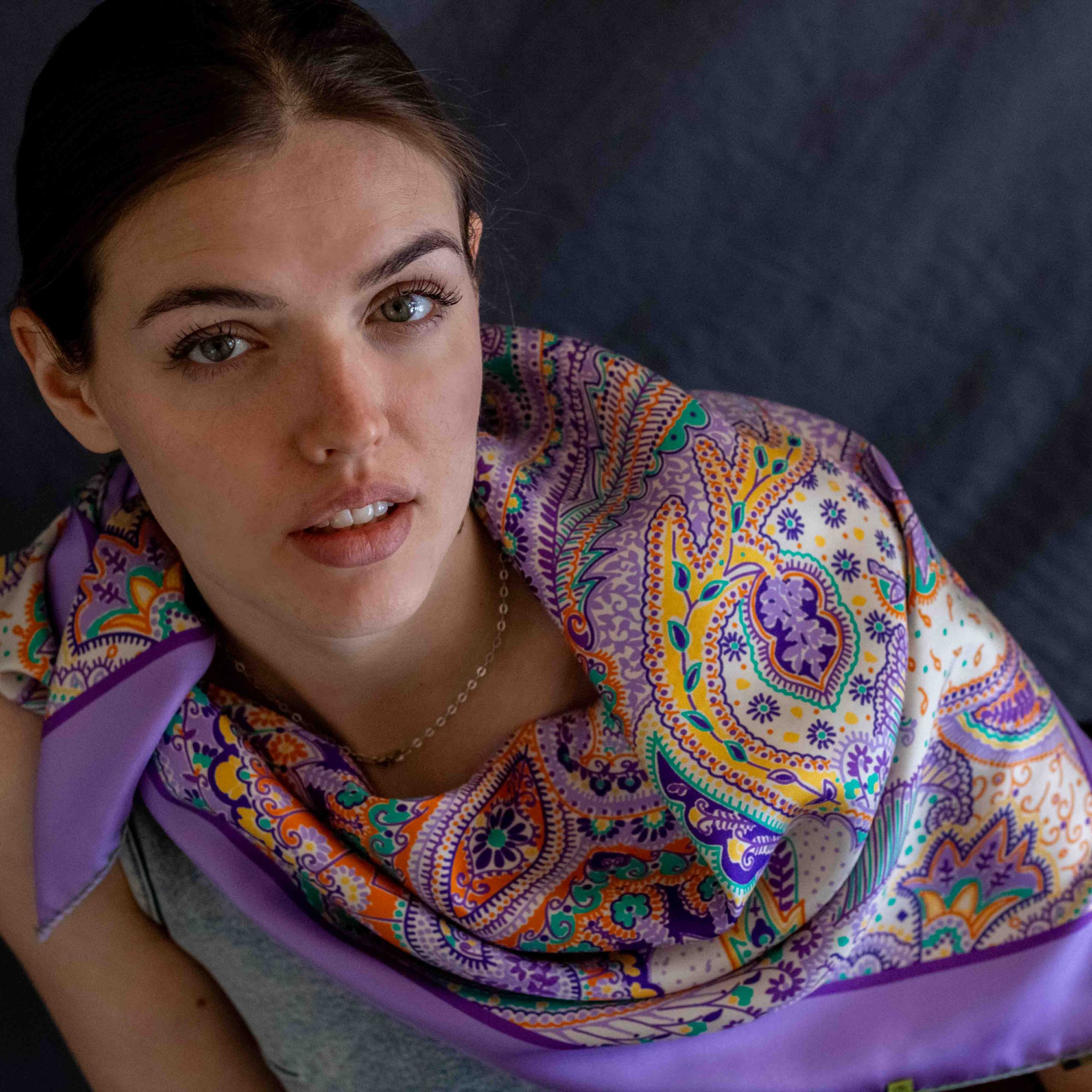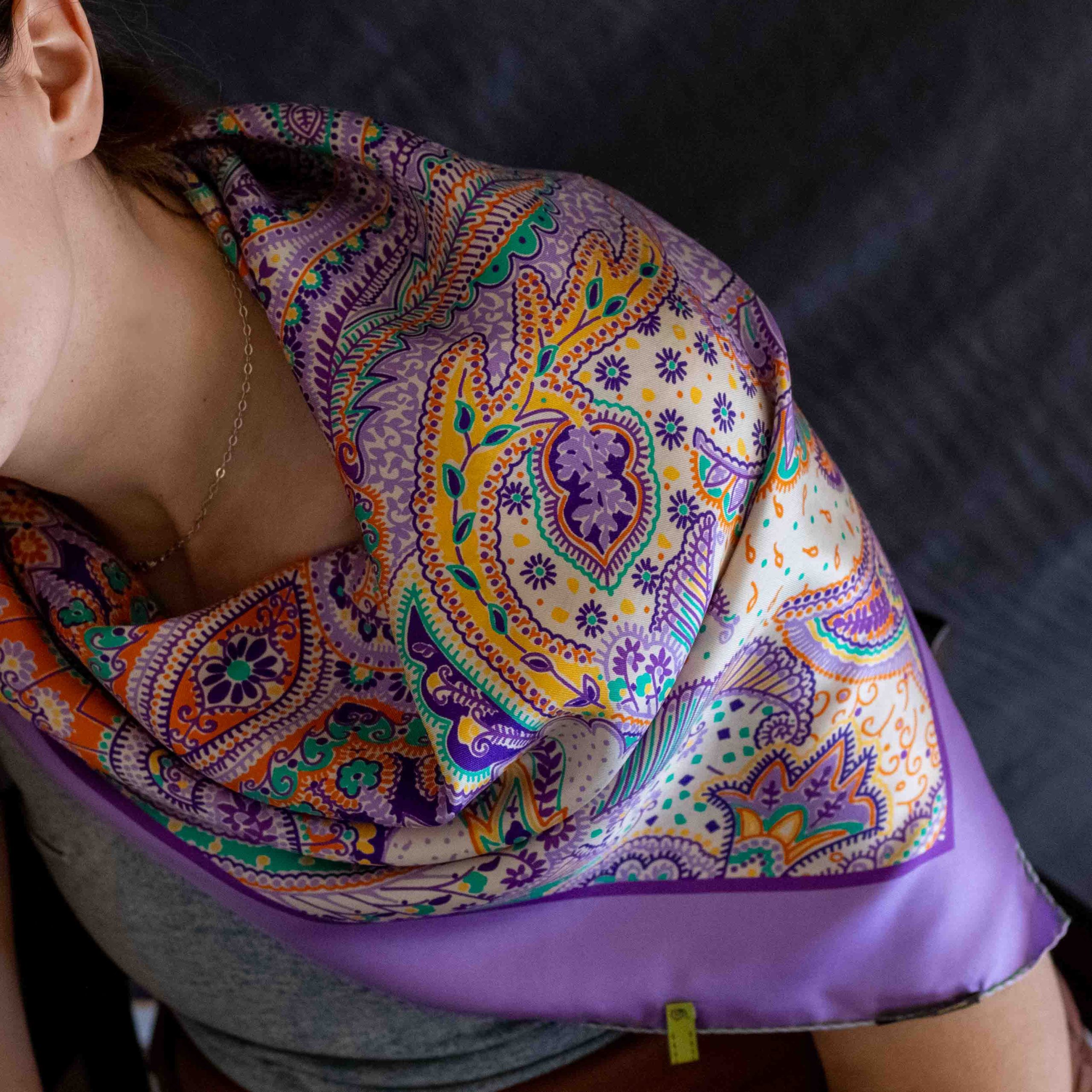 Foulard stampato Made in Italy 100% seta, disegno Paisley, confezione orlo francese verde a contrasto.