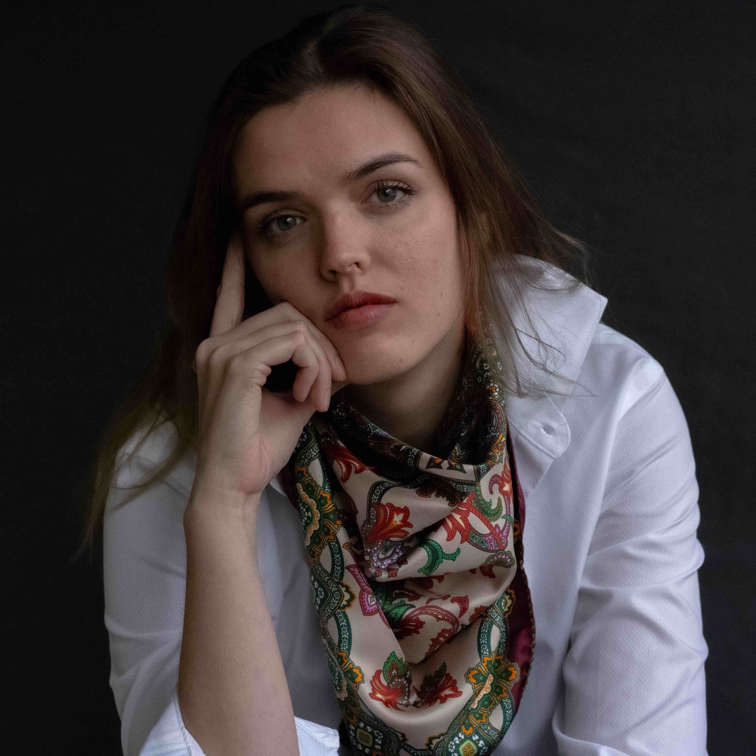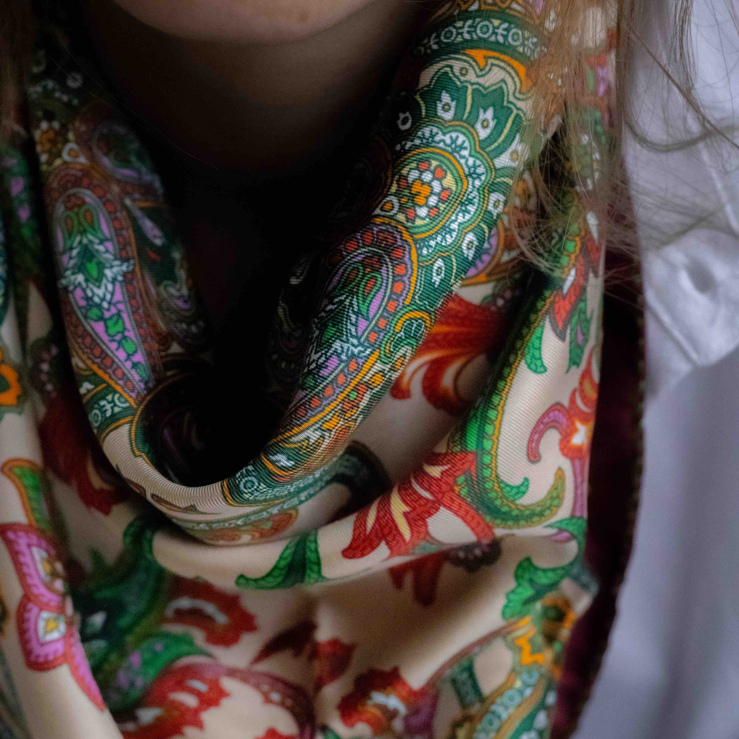 Foulard stampato Made in Italy 100% seta, disegno paisley beige, rosso, verde mattone, confezione orlo francese verde a contrasto.