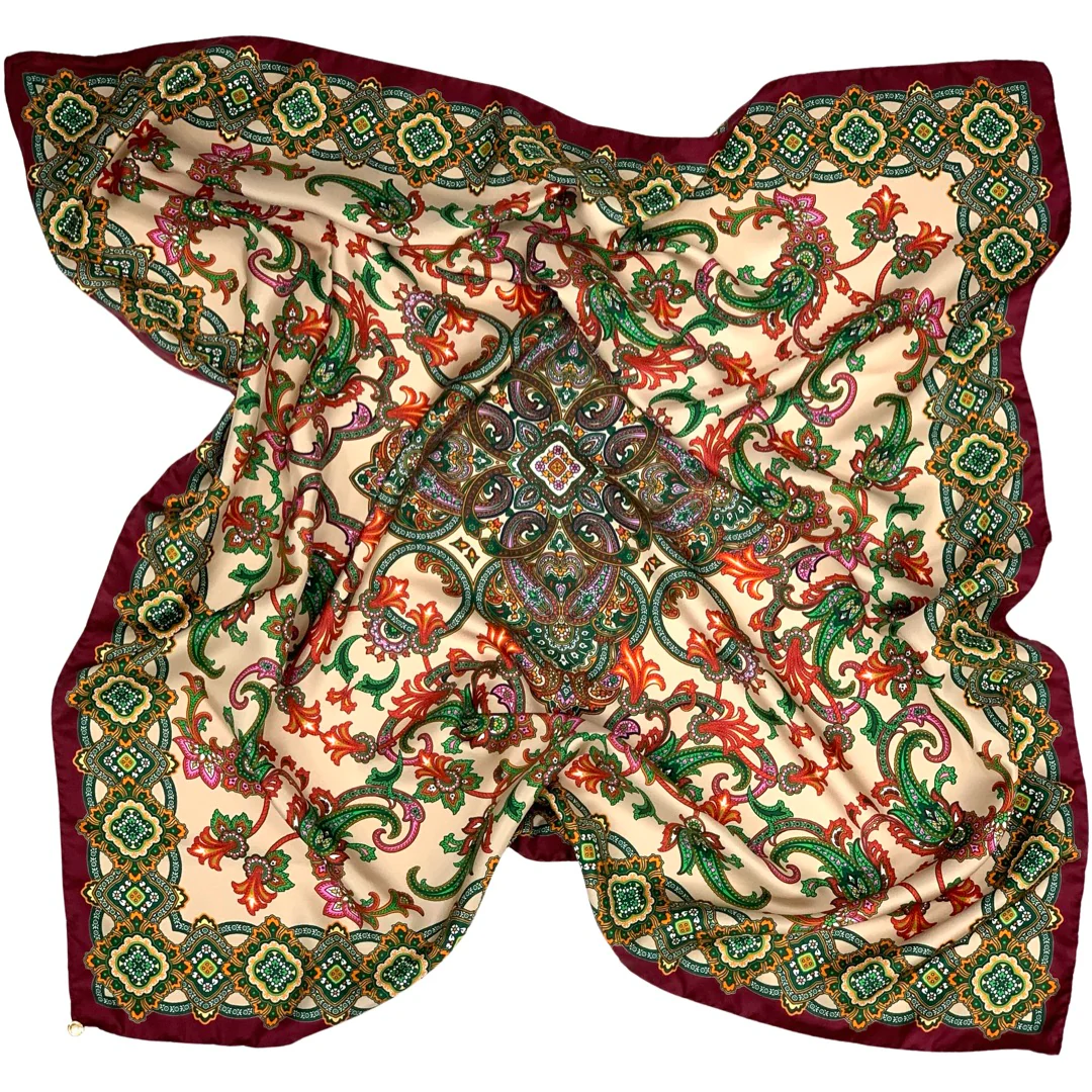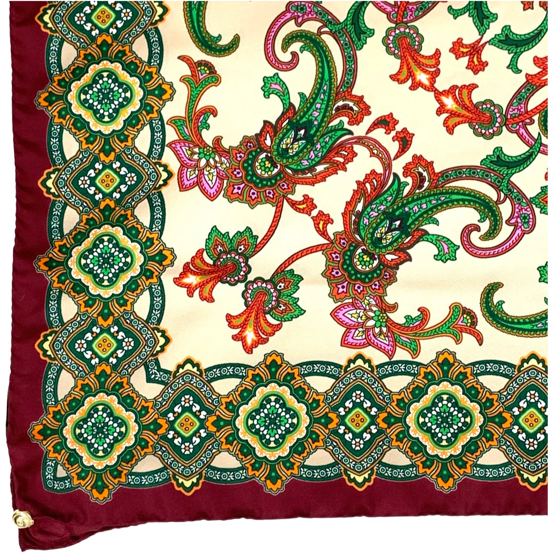 Foulard stampato Made in Italy 100% seta, disegno paisley beige, rosso, verde mattone, confezione orlo francese verde a contrasto. Dimensioni cm 90×90 taglia unica.