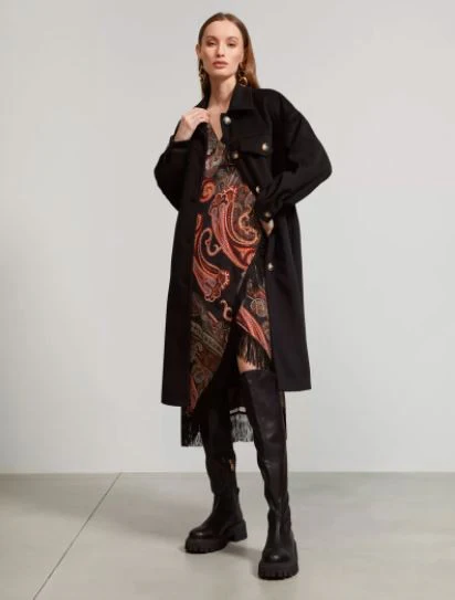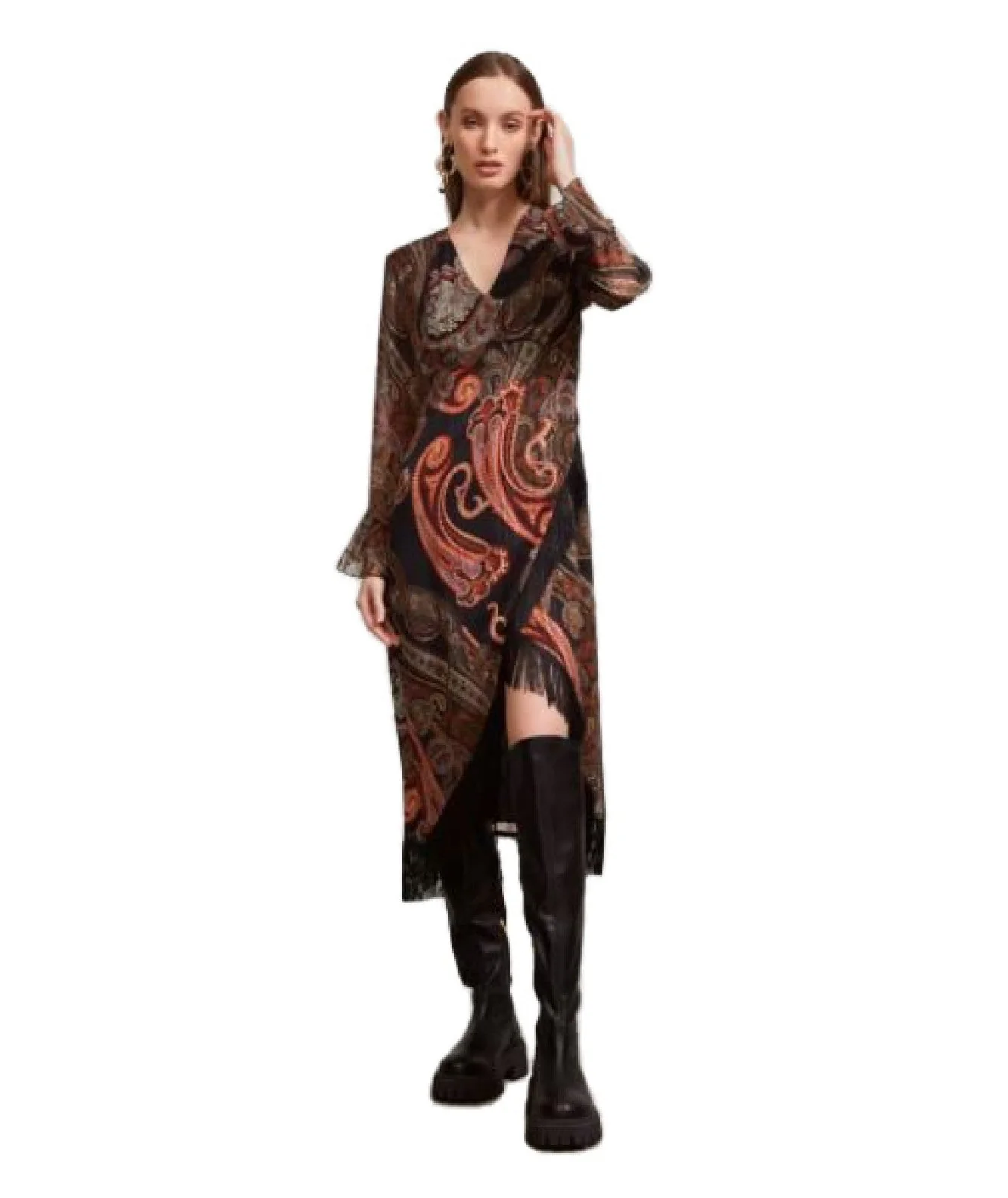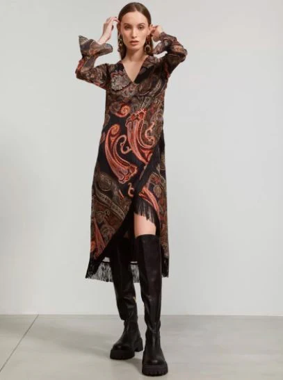 Abito incrociato di Kaos in tessuto a fantasia cashmere multicolore e frange nere ai bordi. Scollo a V. Codice: NIJAJ004/VU
