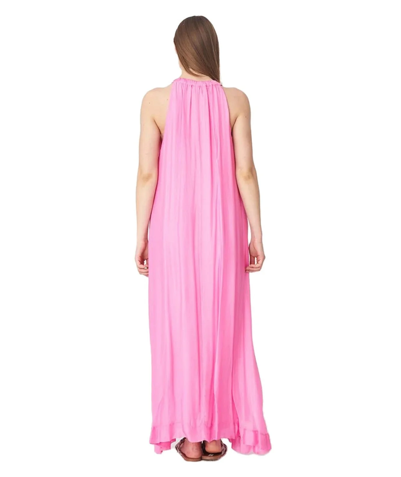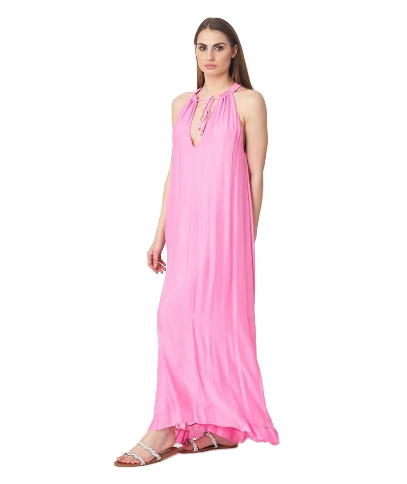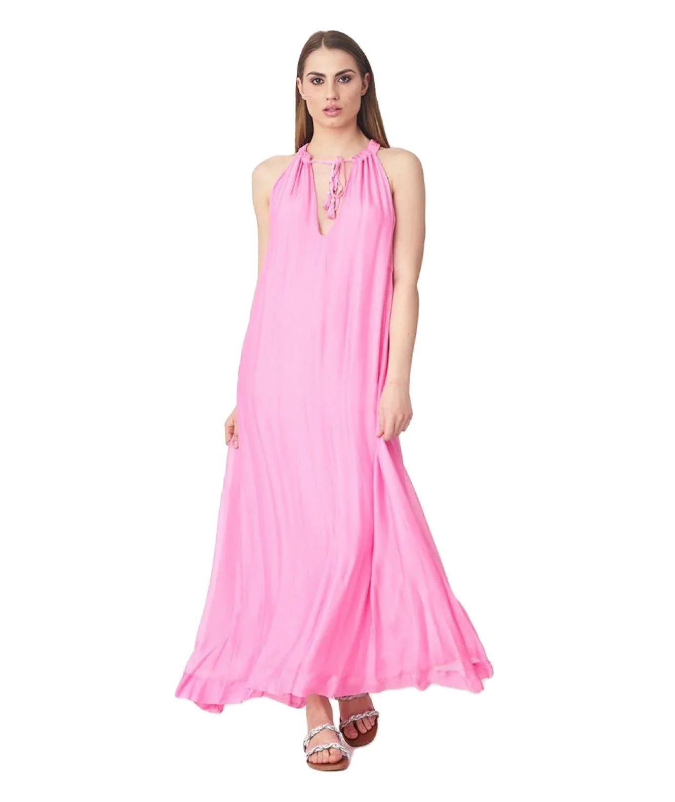 Abito lungo di KAOS JEANS realizzato in tessuto chiffon e misto seta, caratterizzato da scollo all’americana con laccetti da annodare. Codice: QPJCF001 Colore: ROSA