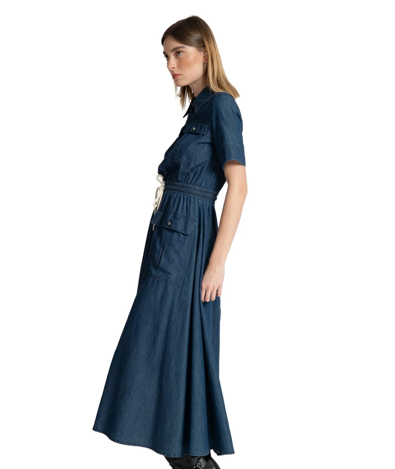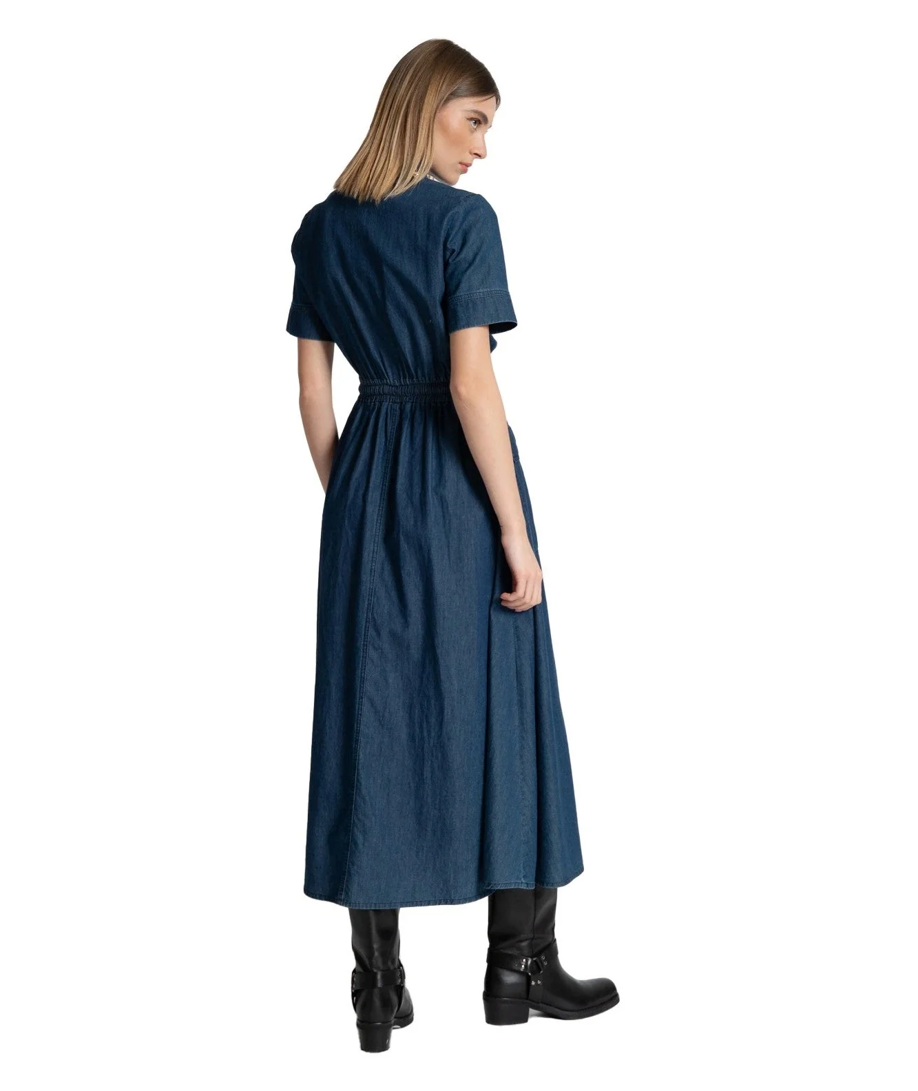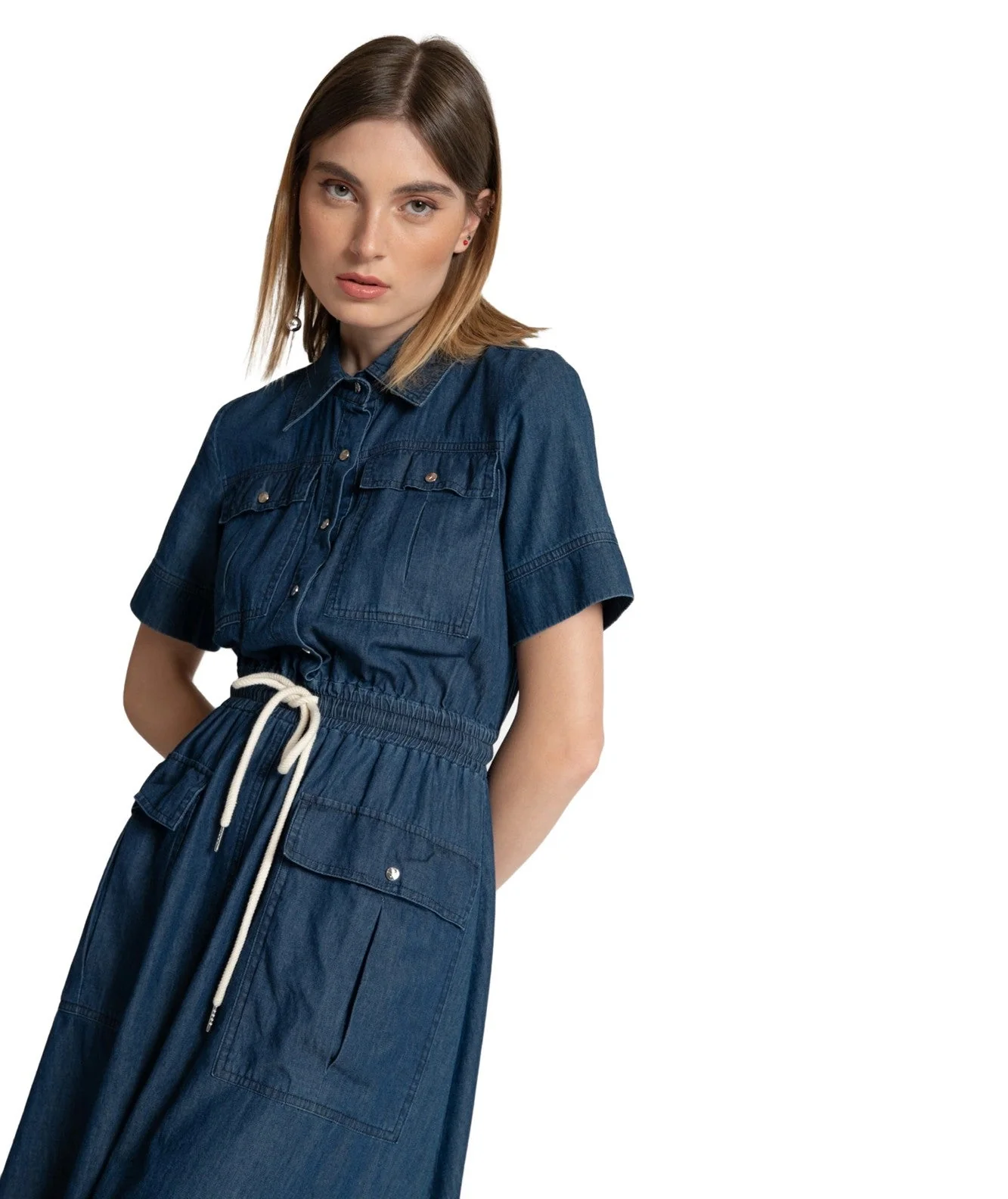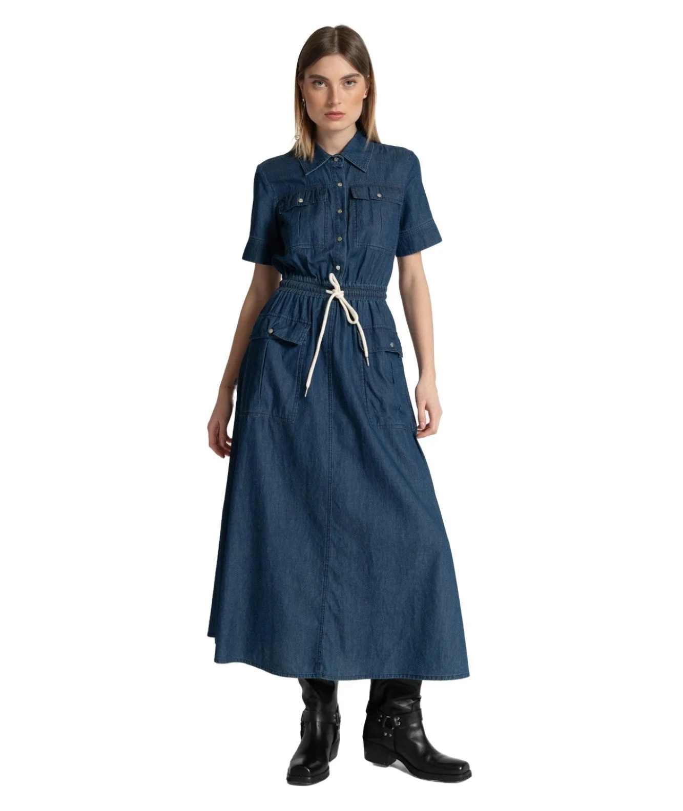 Abito chemisier di KAOS DENIM in tela di cotone, caratterizzato da coulisse in vita e tasche sul davanti. Codice: QP6VK002 Colore: DENIM MEDIO