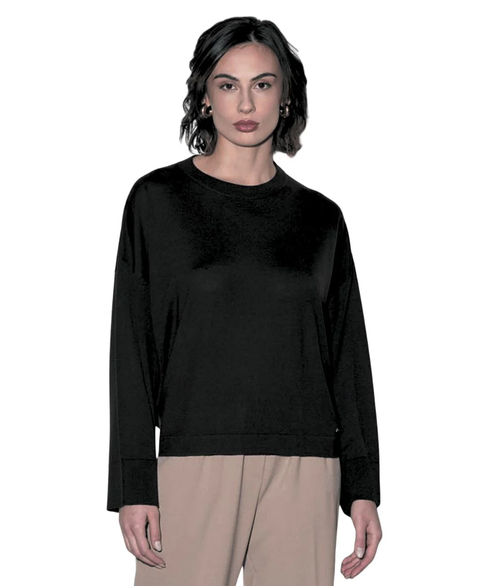 Maglia di KAOS FASHIONRealizzata in leggera lana merinosGirocolloArriccio al fondo sul retro Maniche ampie Codice: RI1NT026 Colore: Nero 0001 Composizione: 100% Lana