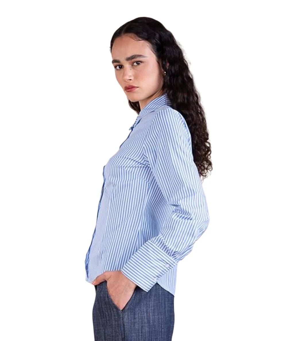 Camicia di KAOS JEANSRealizzata in misto cotone stiro facileVestibilità regolare con penceAbbottonatura camiciaFantasia a bastoncino azzurro e bianco Codice: RPJCF012 Colore: Azzurro 3005