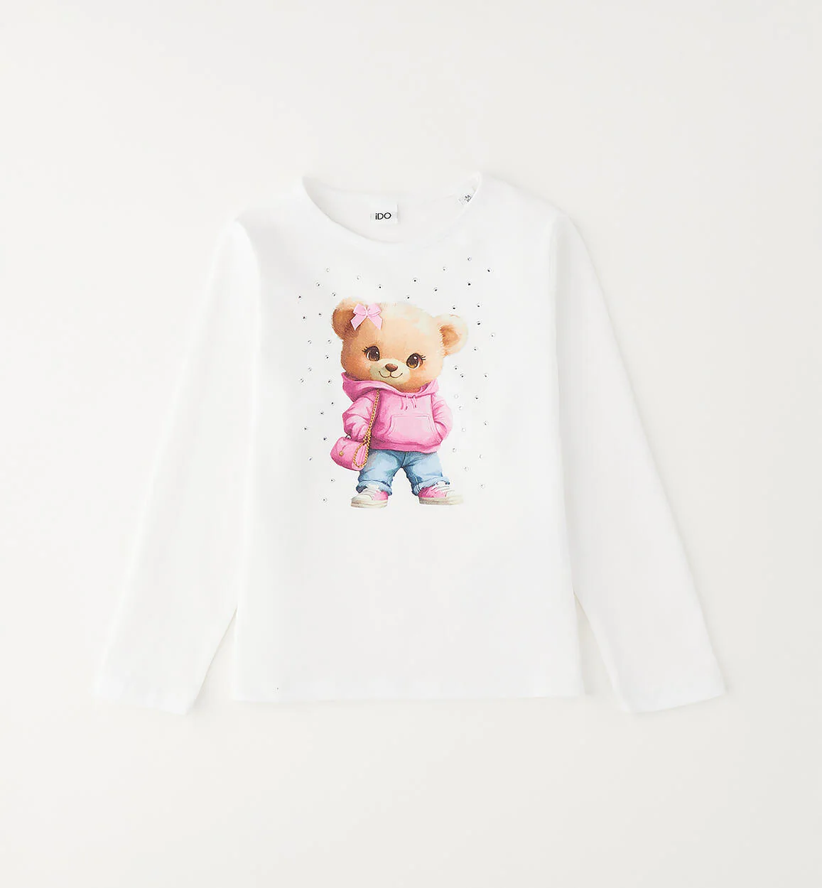 Girocollo manica lunga per bambina iDO realizzata in jersey stretch di cotone con stampa orsetta, fiocco in applicazione e strass.