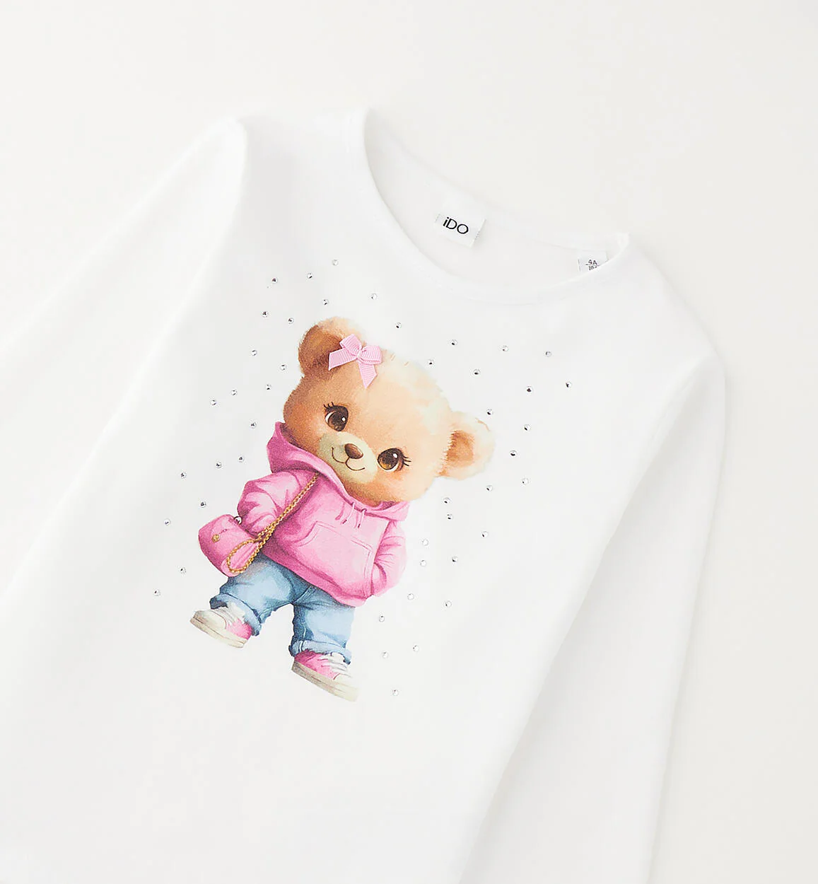Art. 4G345.00.0113 Girocollo manica lunga per bambina iDO realizzata in jersey stretch di cotone con stampa orsetta, fiocco in applicazione e strass. Composizione: 95%Cotone 5%Elastan