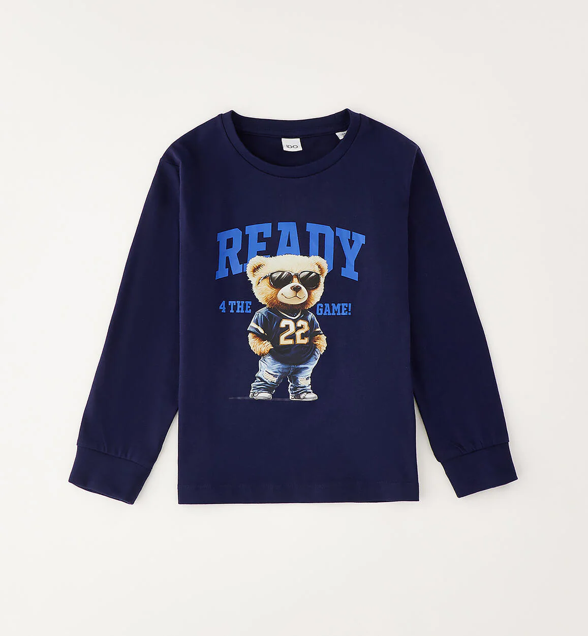 Girocollo manica lunga per bambino iDO realizzata in jersey 100% cotone con stampa orso. Polsino sul fondo manica.