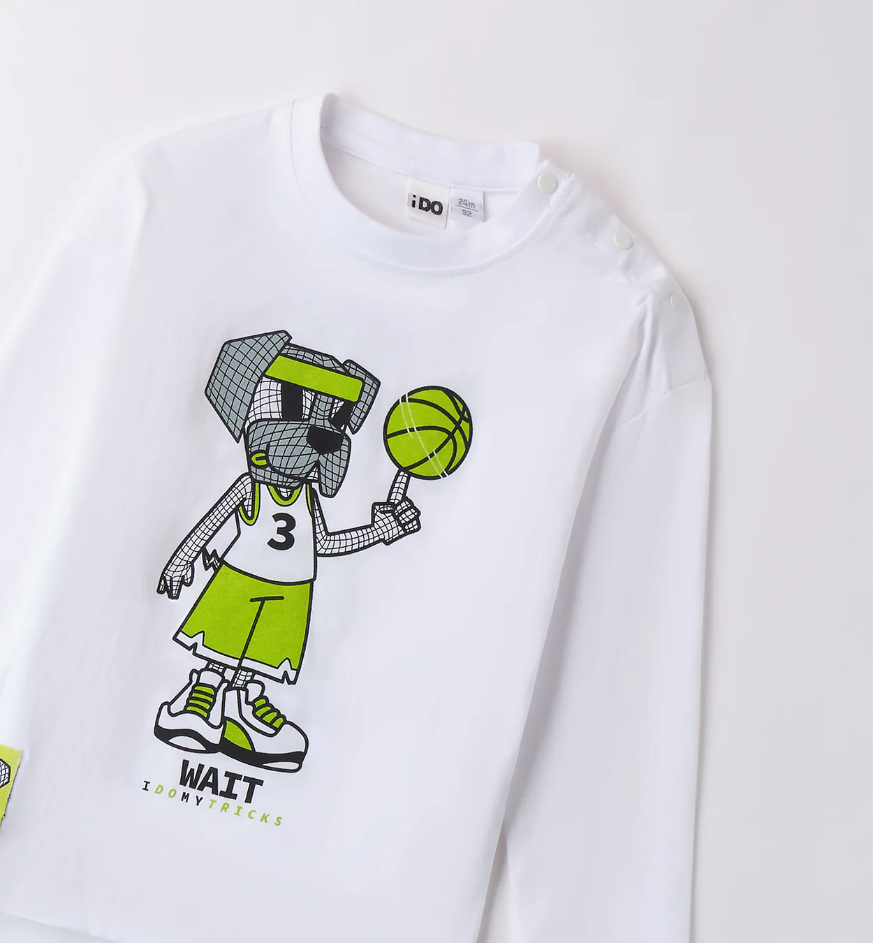 Maglietta per bambino iDO da 9 mesi a 8 anni realizzata in jersey stretch di cotone. Il modello presenta apertura sulla spalla con bottoni a pressione fino alla taglia 3 anni, polsini sulle maniche e fantasia tinta unita con stampa frontale. Composizione: 100%Cotone Art. 4B251