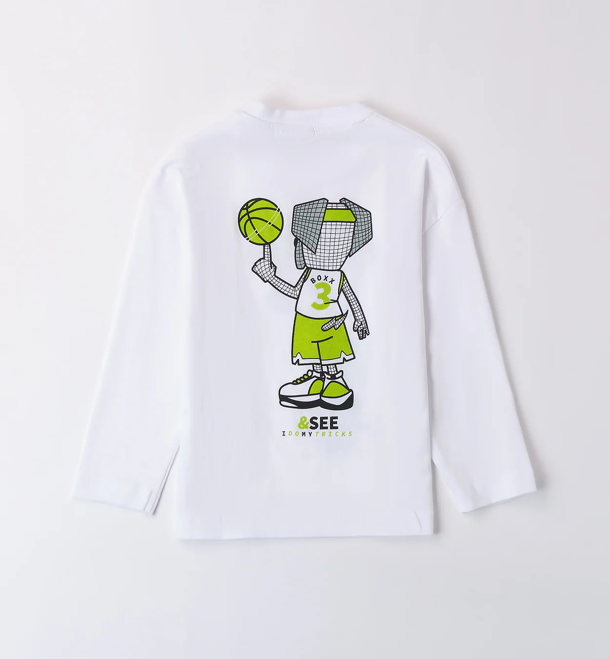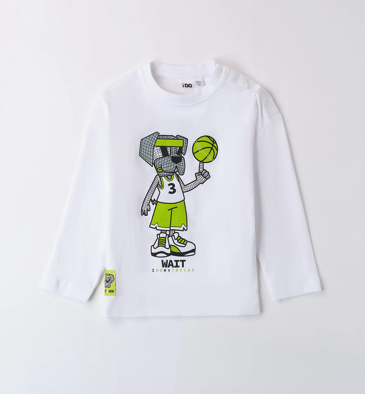 Maglietta per bambino iDO da 9 mesi a 8 anni realizzata in jersey stretch di cotone. Il modello presenta apertura sulla spalla con bottoni a pressione fino alla taglia 3 anni, polsini sulle maniche e fantasia tinta unita con stampa frontale.