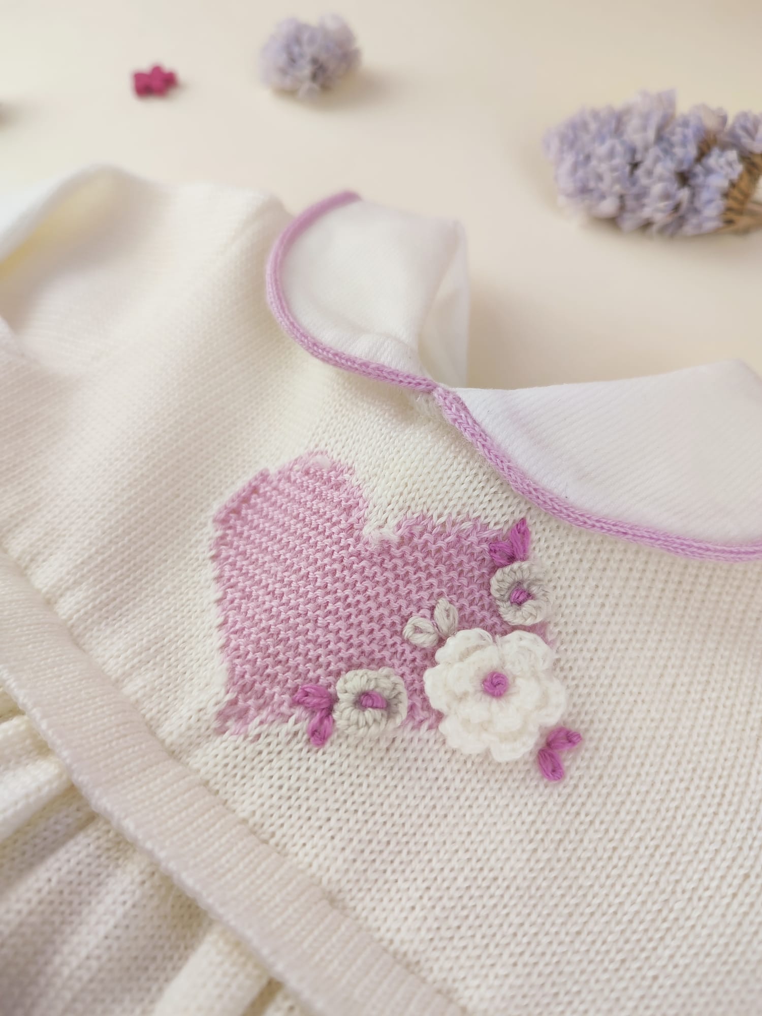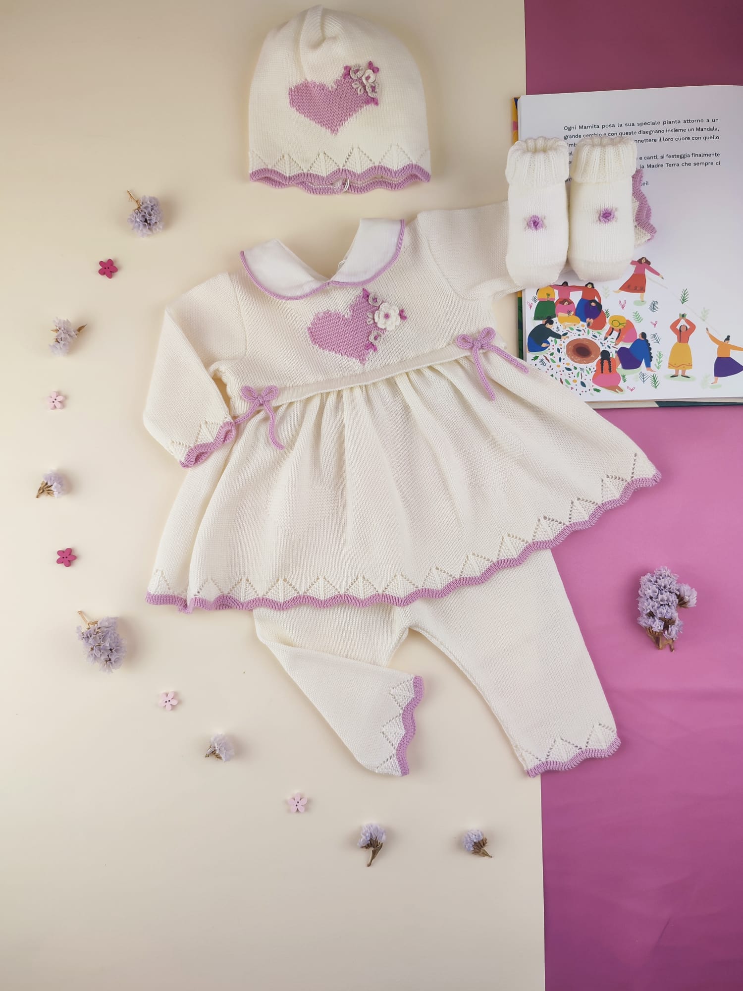 🐿️Collezione Autunno Inverno 2026 ☃️ La capsule Fleurs d’Amour nasce per celebrare la dolcezza dei primi gesti d’amore💮Ogni capo è realizzato in 100% lana merino con fili naturali e dettagli all’uncinetto che richiamano piccoli fiori sbocciati intorno a un cuore centrale, simbolo di affetto e protezione. Le sfumature malva donano un tocco delicato e romantico, perfetto per le bimbe che amano la tenerezza💮 Un piccolo capolavoro fatto a mano, pensato per avvolgere ogni giorno di poesia, comfort e amore autentico. Il prezzo include: completo cuore (vestitino + pantaloncino) ricamato a mano con fiori ad uncinetto e bordini malva cappellino cuore ricamato…