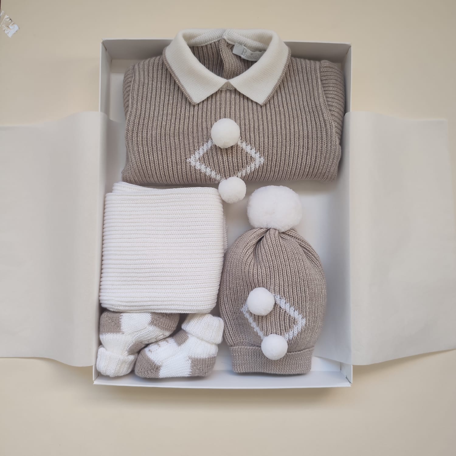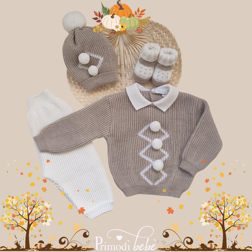 🍁NUOVA COLLEZIONE AI 2024 ❄️ Mini set per lui, con lavorazione maglia inglese e design di rombi con soffici pom pom realizzati a mano, in un elegante latte/tortora. Comprende: 1 completino maglietta + pantaloncino, 1 cappellino, 1 paio di scarpette. Elegante, morbido, avvolgente🍁 Consulta la nostra Guida alle taglie per tutte le info!🪡 100% lana merino Lavaggio a mano a basse temperature Made in Italy