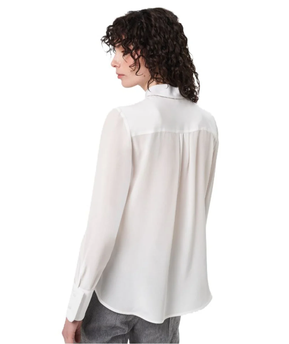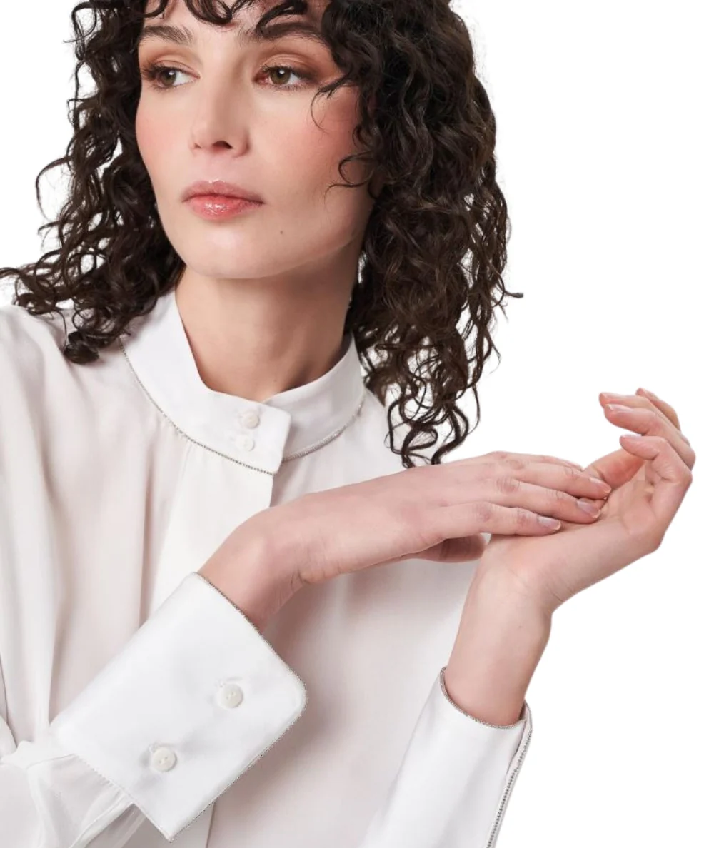 Camicia di MONDRIAN VENEZIA by CAMICETTA SNOBRealizzata in crepe de Chine di setaVestibilità fluidaCollo alla coreana Due bottoni a vista e abbottonatura a polo nascostaDettaglio della passamaneria a punto luce Catenella argento inserita nello scollo Manica regolare con polso alto a due bottoniCarrè sul retro con cannoncino Camicia medio lunga, lunghezza fianco medio basso Made […]