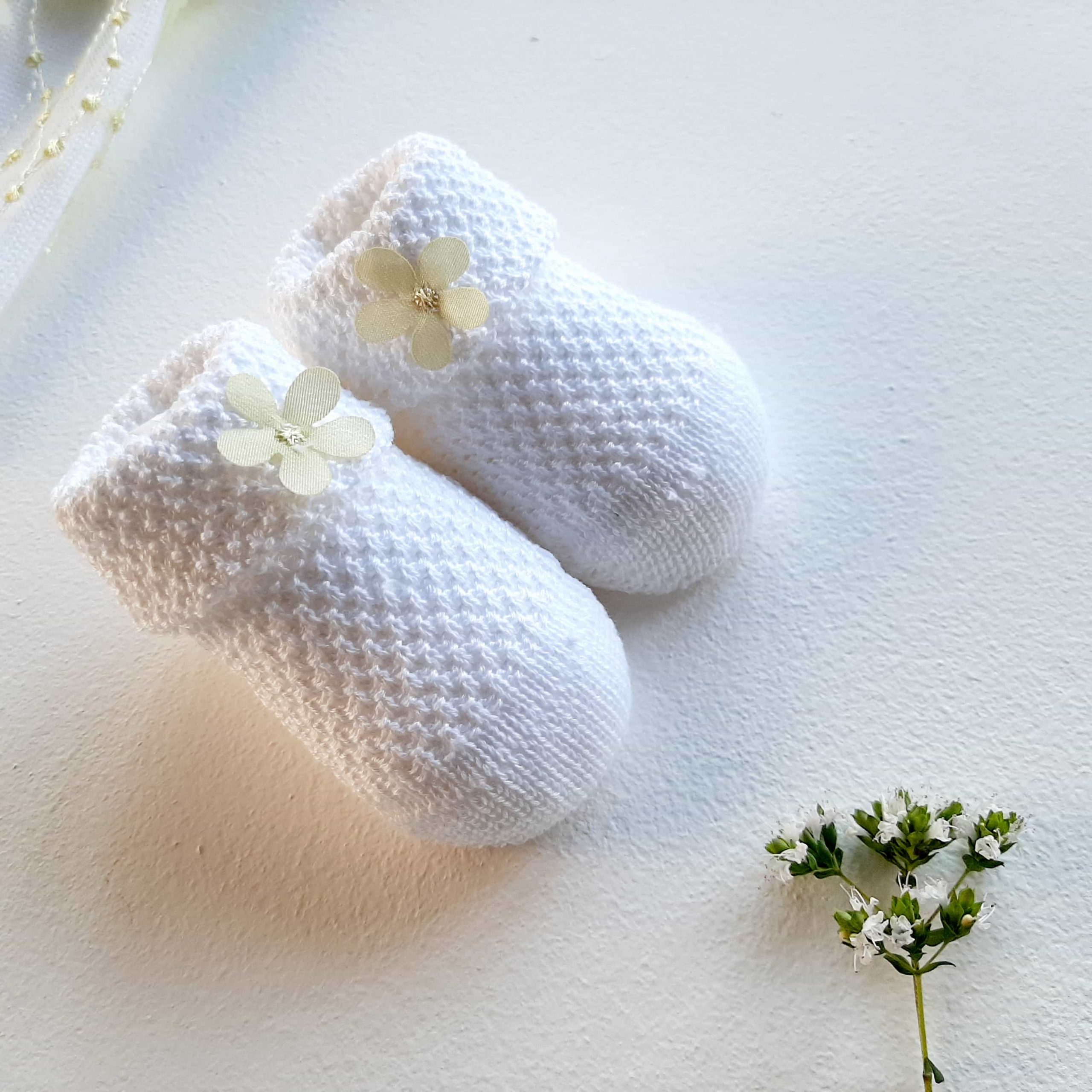 Candide scarpette in filo di scozia extrafine adornate da un fiorellino giallo. Perfette con il nostro coprifasce e cappellino in coordinato! 100% cotone Fiorellino: tessuto in poliestere Ricamato a mano Lavaggio a mano a basse temperature Made in Italy