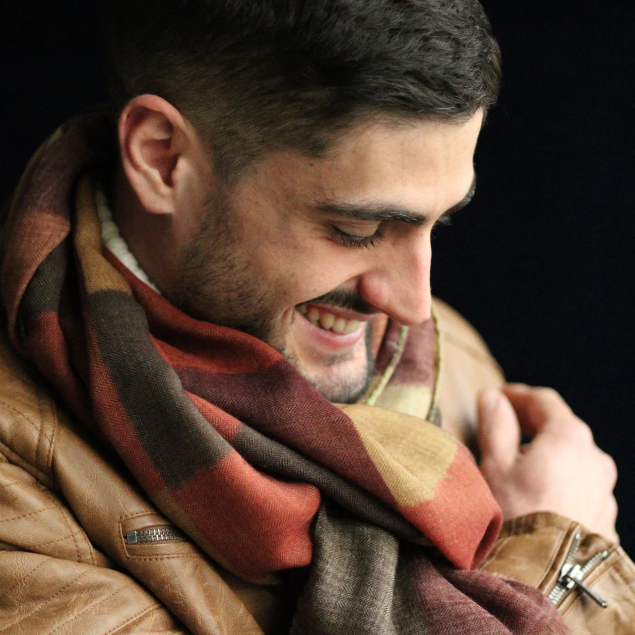 Sciarpa Uomo pura Lana stampata disegno quadri sfumati colore Arancione Cod. 702