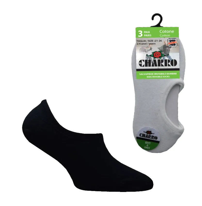 CALZINO INVISIBILE IN COTONE ELASTICIZZATO CHARRO. TG: 2/4 – 6/8 – 10/12. COLORE: BIANCO – NERO – BLU. TRIPACK. Prezzo tripack