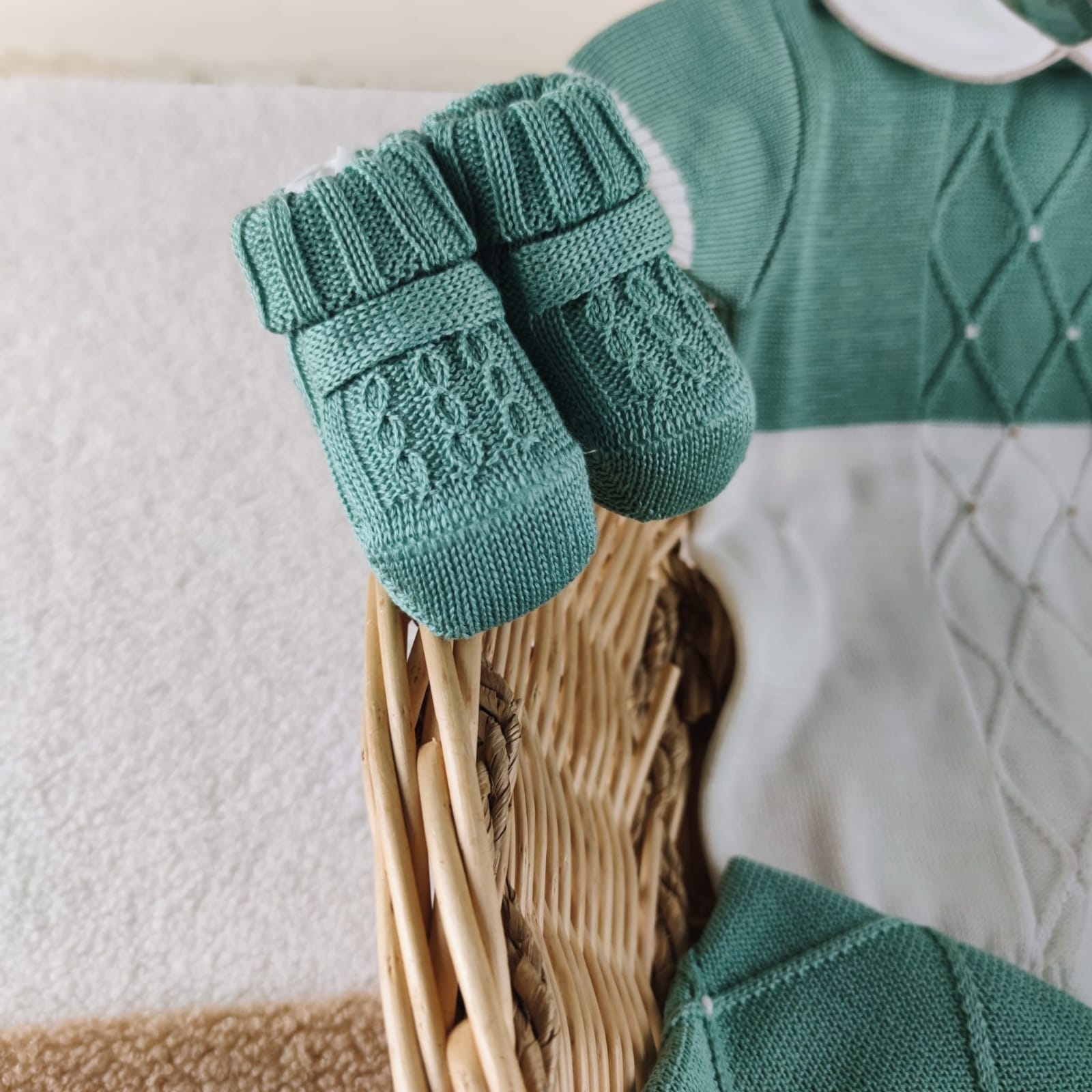 Set nascita con design di piccoli rombi, in un colore che amiamo: il verde smeraldo. Il set è composto da: Copertina con piccoli pois ricamati a mano e uncinetto lungo i bordi, pagliaccetto bicolore con ricamo, cappellino e scarpine in coordinato ricamate a mano. Un set nascita ideale per tutte le nascite da maggio a ottobre, in un colore splendido, che richiama tutta la naturalezza e brillantezza del filo di scozia. 100% puro cotone filo di scozia certificato OEKO-TEX Lavaggio a mano a basse temperature Design e dettagli ricamati a mano Made in Italy