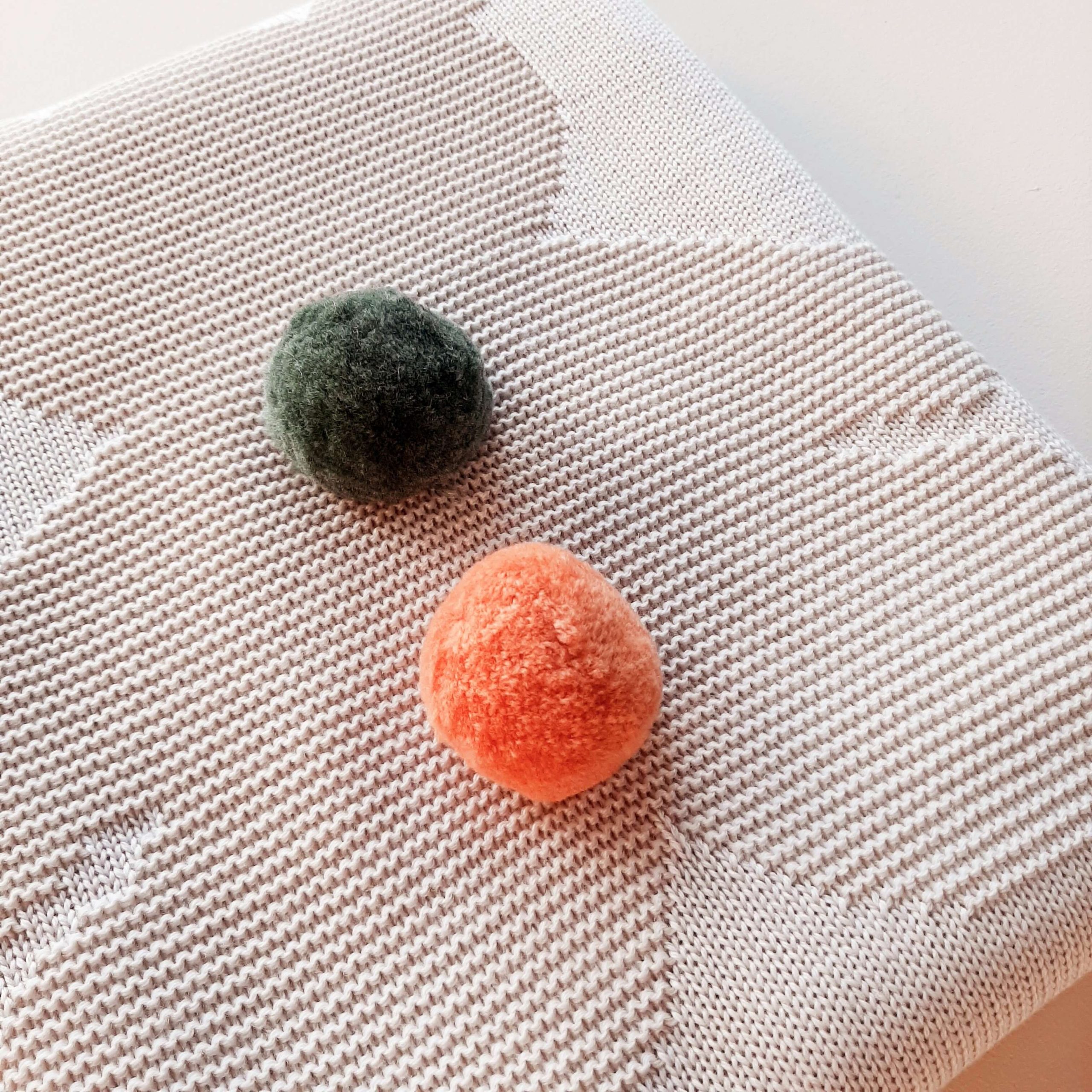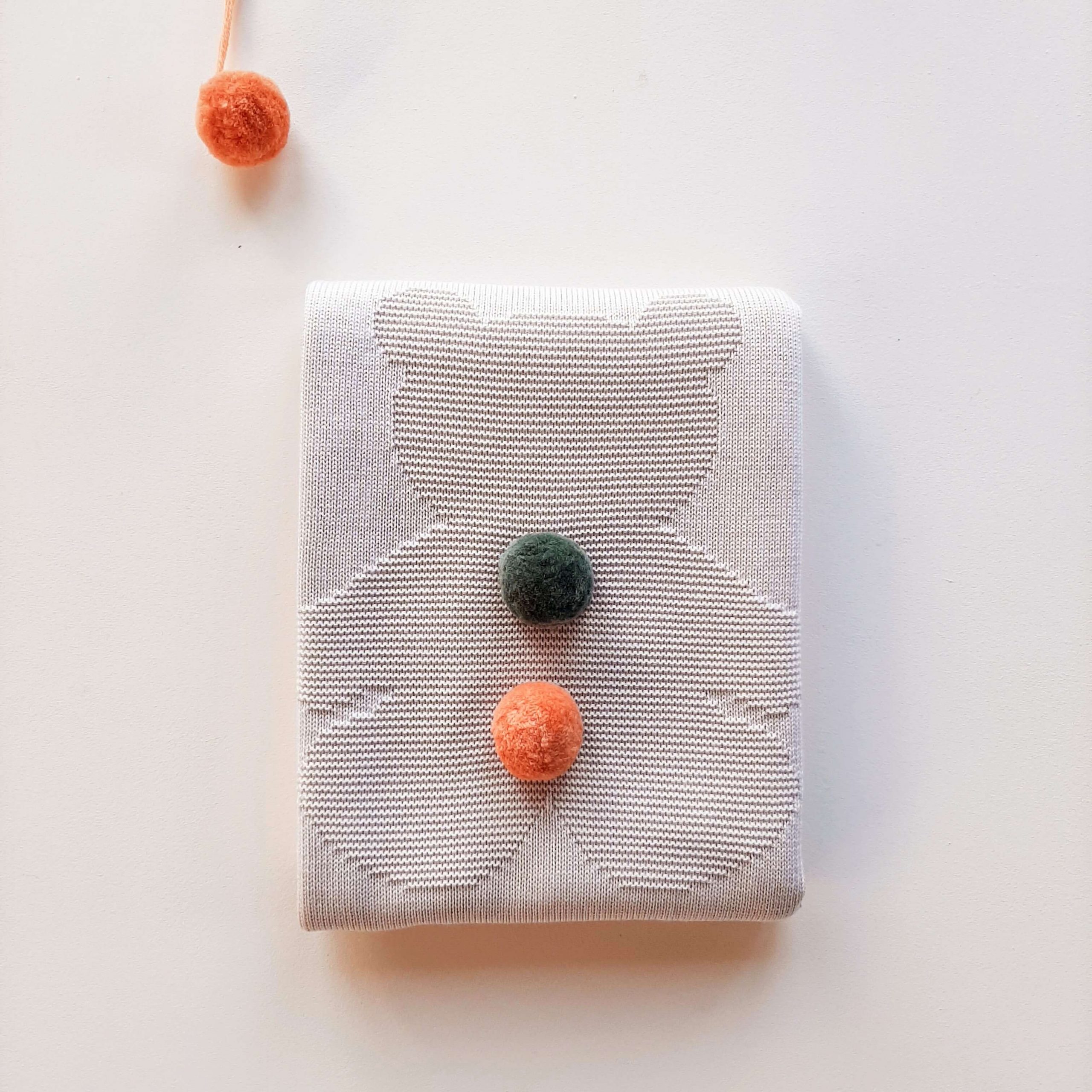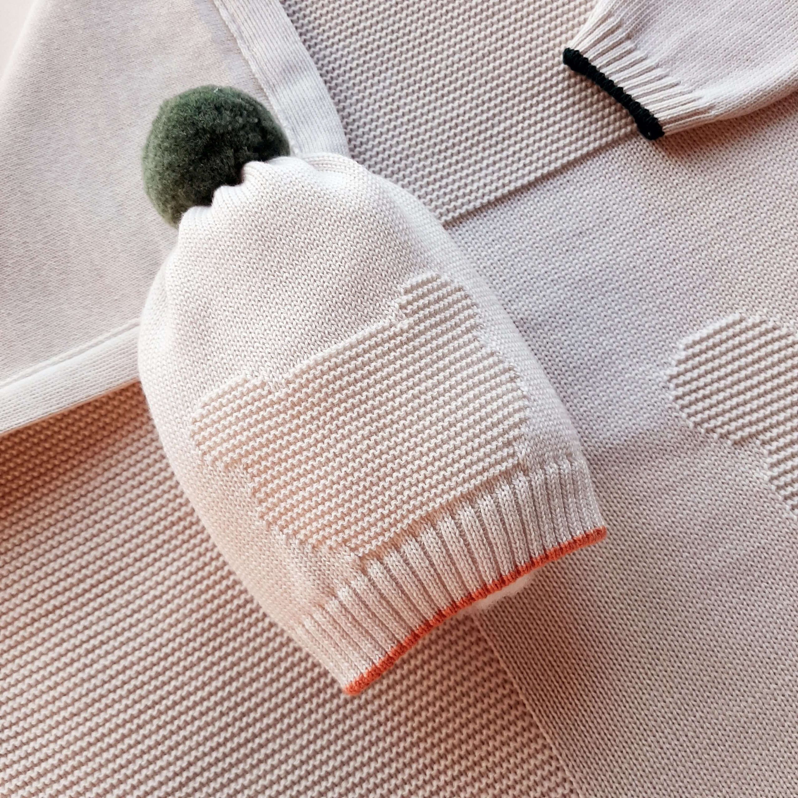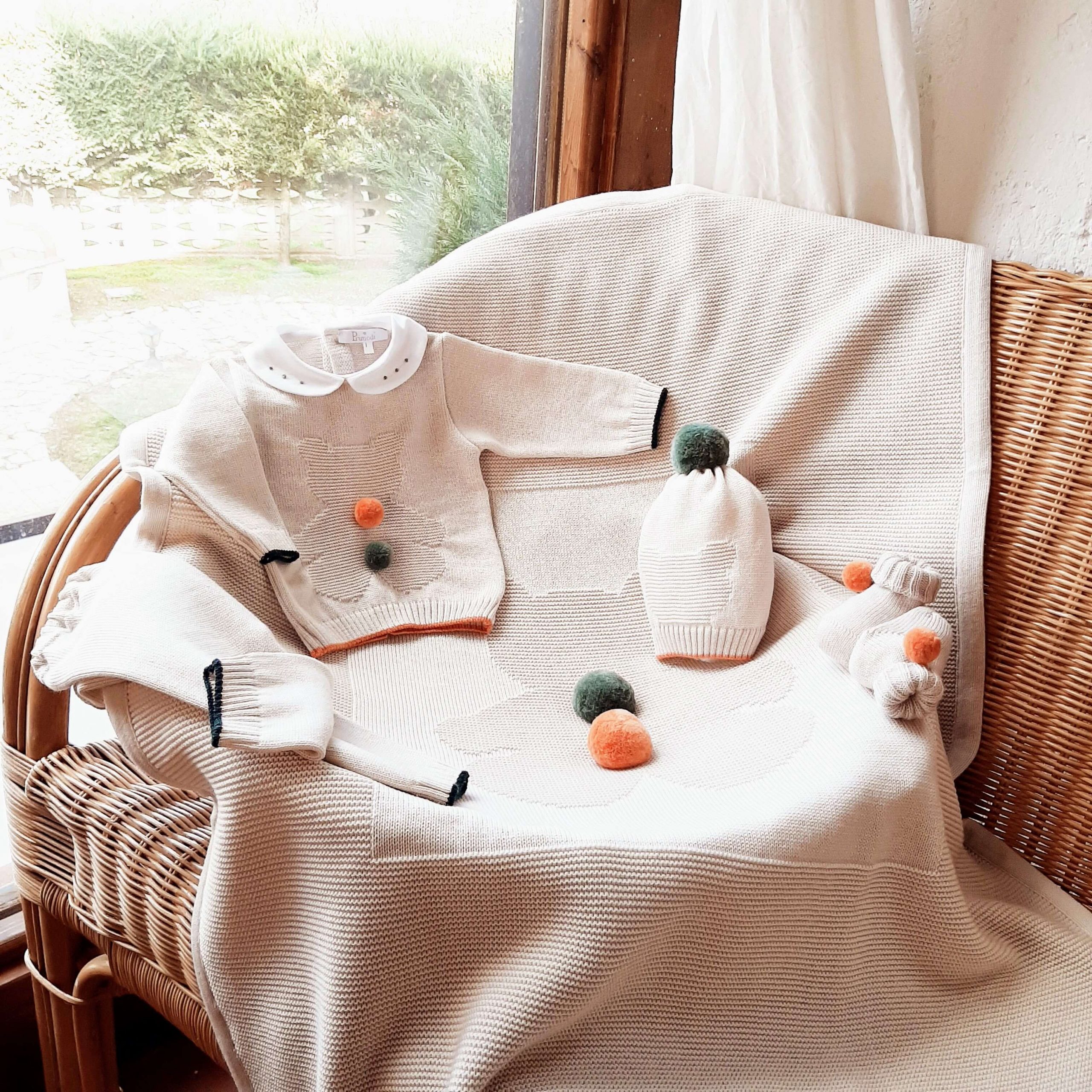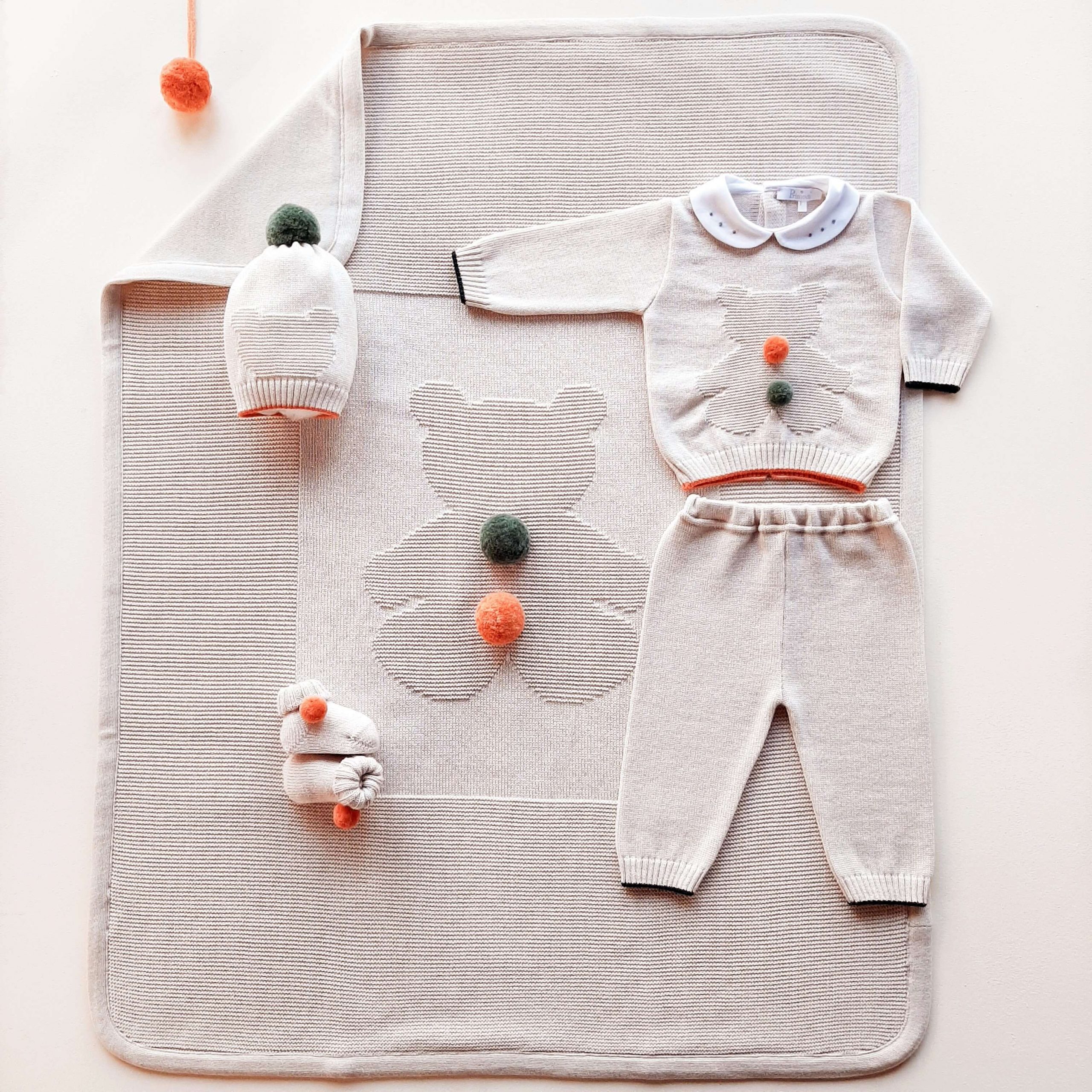 DISPONIBILE SOLO ONLINE Soffice set neonato in 100% lana merino a tema orsetto: le sfumature naturali del beige sono unite all’energia, al divertimento, al calore dell’autunno trasmesso dall’arancio e dal verde bosco. L’orsetto è realizzato con lavorazione a links tono su tono, mentre i pom pom arancioni e verdi sono realizzati a mano. Questo particolare accostamento cromatico e l’unicità del fatto a mano è presente in tutti e 4 gli elementi del set, composto da: Completino due pezzi neonato con colletto modello peter pan ricamato a mano e pom pom; Copertina foderata con orsetto a links e pom pom; Cappellino…