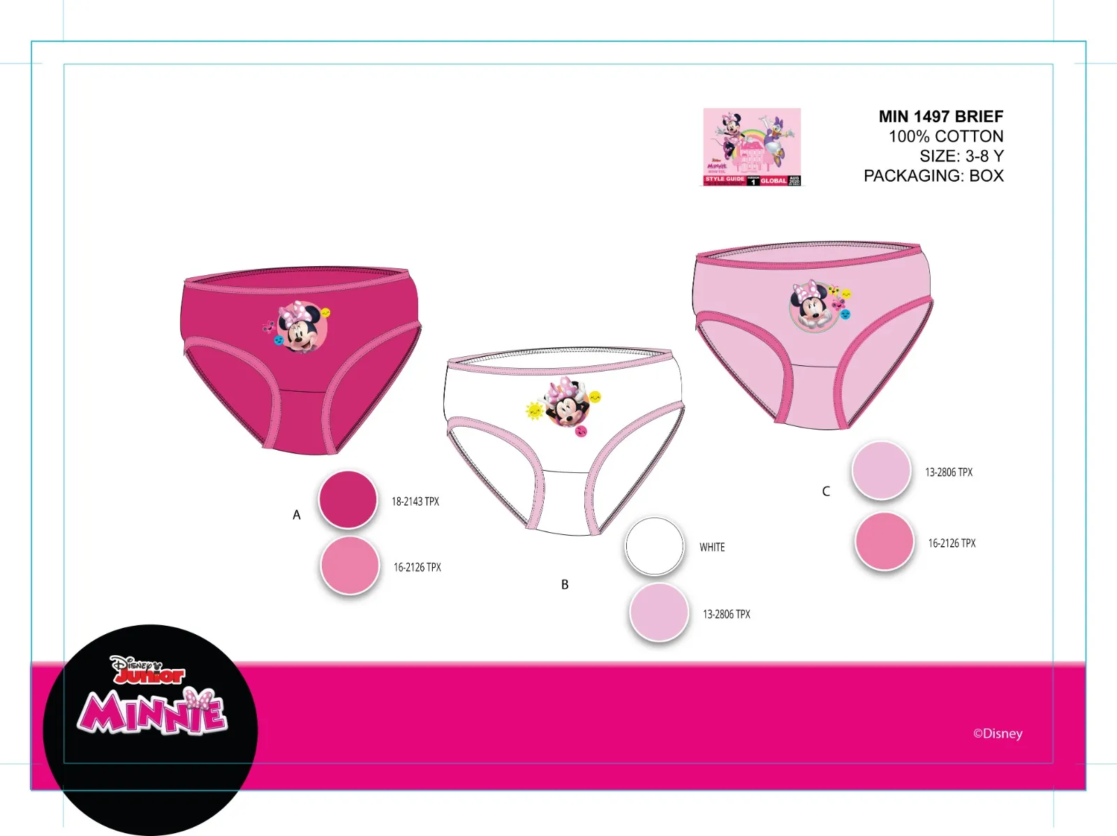 SLIP BIMBA IN COTONE MINNIE MOUSE. TG: 3/4 – 5/6 – 7/8. COLORE: ASSORTITO. TRIPACK. Prezzo tripack ASSORTIMENTO DA 8 TRIPACK: 3PCS 3/4-ASSORTITO; 3PCS 5/6-ASSORTITO; 2PCS 7/8-ASSORTITO