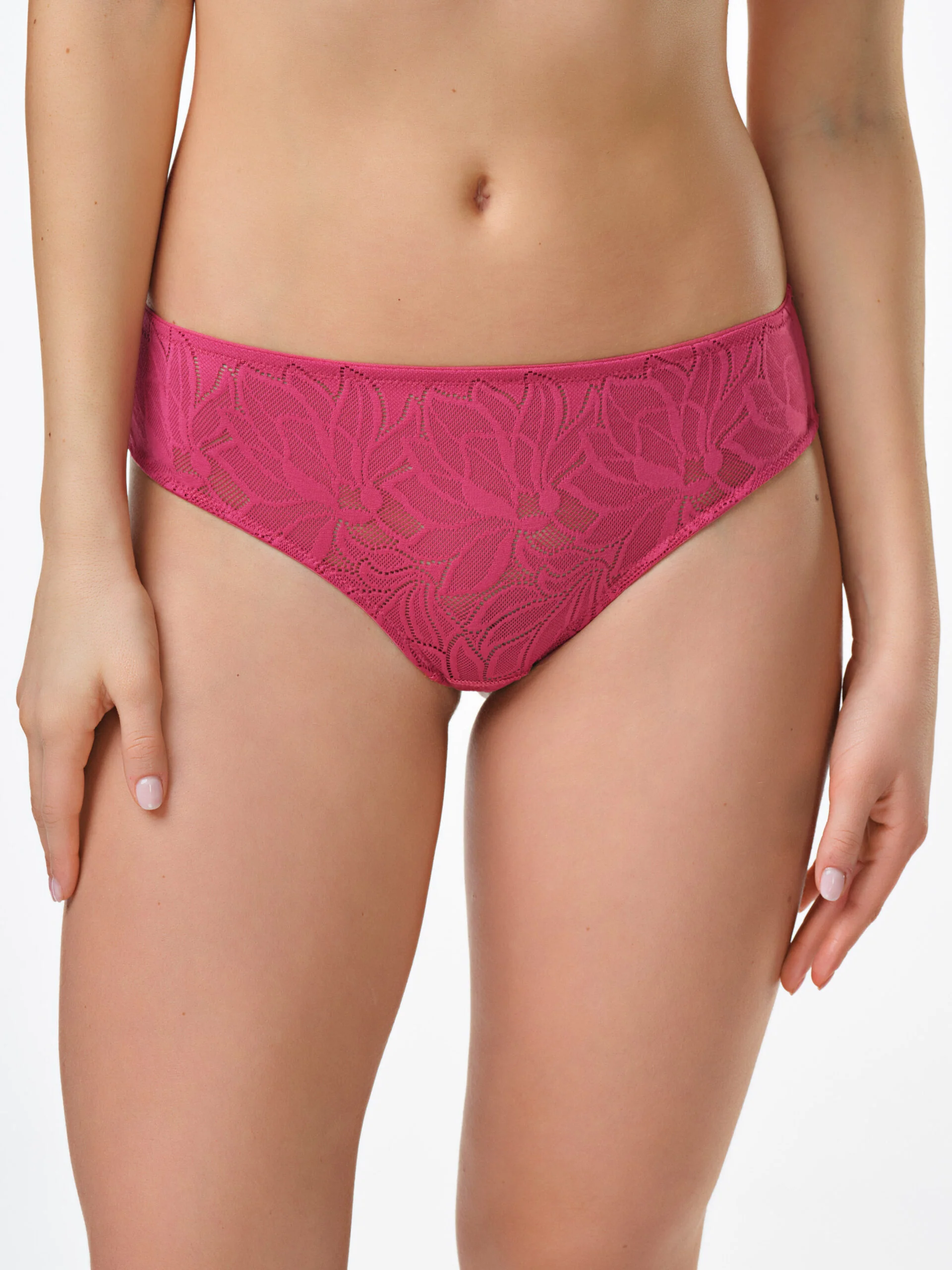 Slip realizzato in tessuto elastico jacquard con disegno dal motivo floreale e taglio vivo nella parte posteriore. La pattina interna in 100% cotone garantisce freschezza e igiene.