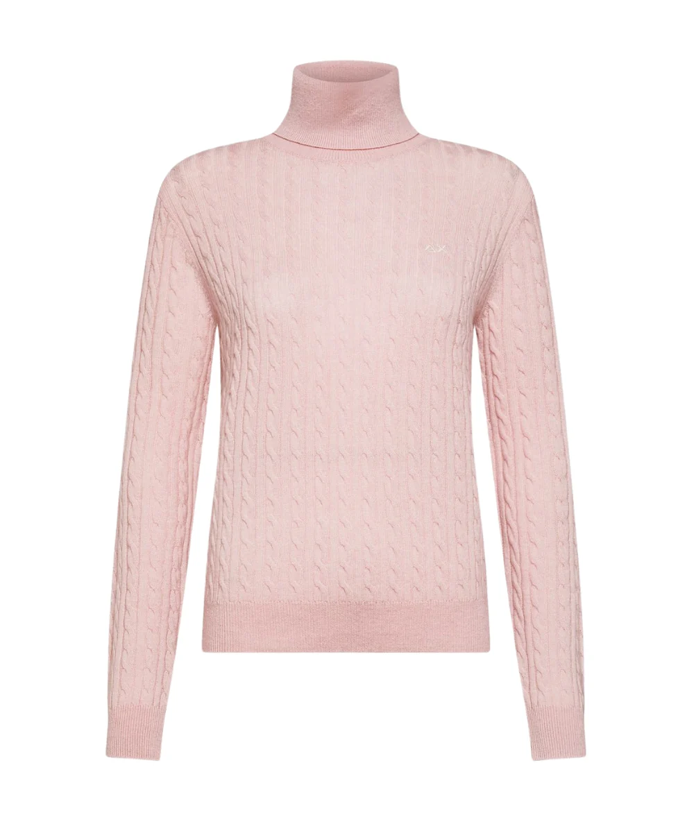 Dolcevita di SUN68Realizzato in misto lana e cashmereLavorazione a trecceCollo alto Maniche lungheBordi lavorati a costineLogo ricamato sul petto Codice: K45249 Colore: Rosa Chiaro 04 Composizione: 90% Lana 10% Cashmere