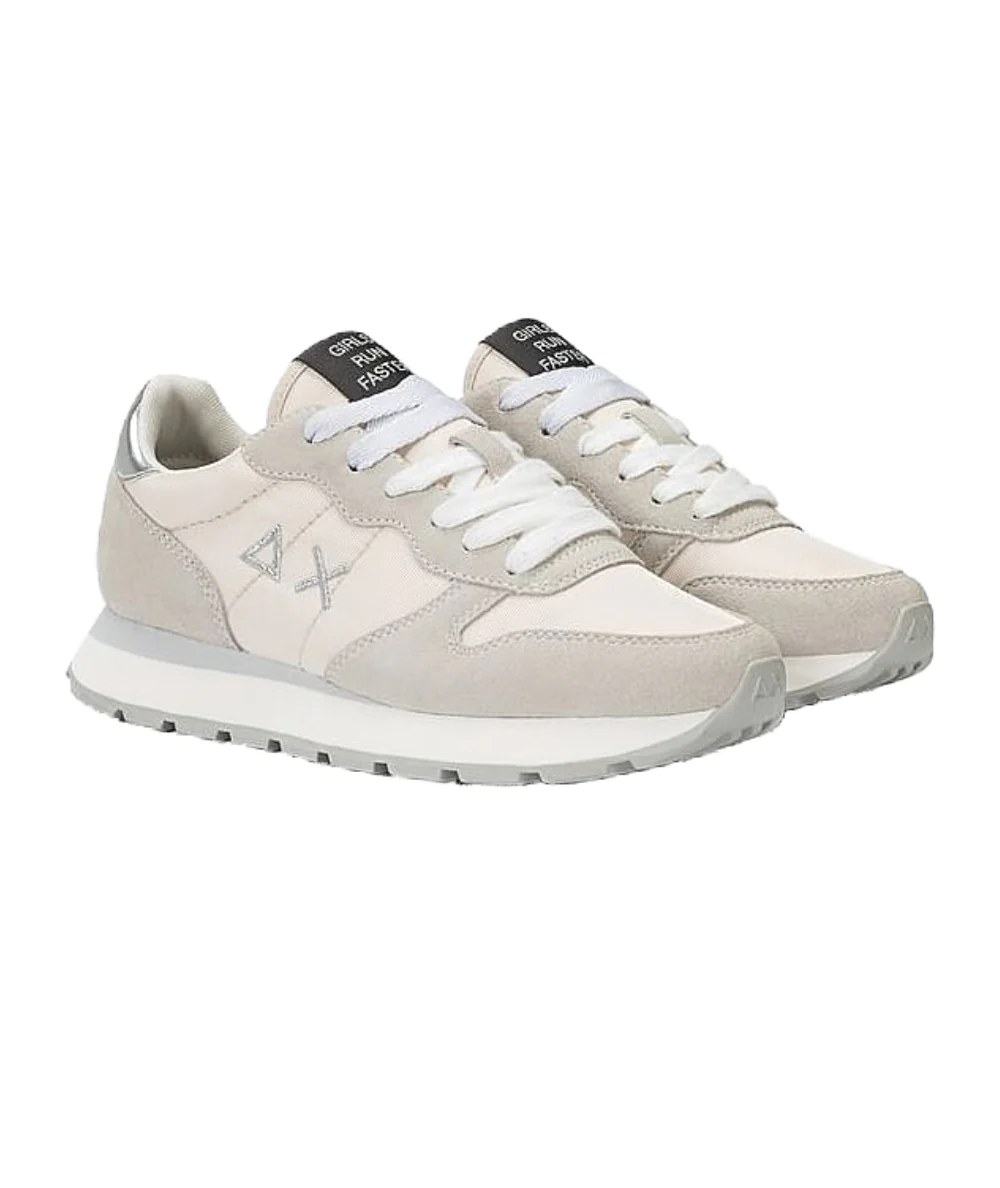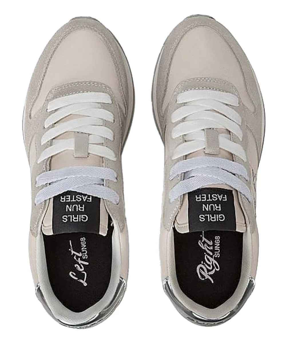 Scarpa ginnica da donna di SUN68 Stile running Realizzata in bimateriale, nylon e suede Etichetta con lettering ricamata sulla linguetta Logo SUN68 sullo spoiler color argento Chiusura con lacci Fodera in micro mesh Suola in EVA fresata a mano Soletta estraibile alta 1,7 cm Altezza della suola: 3 cm Modello: ALLY GOLD SILVER Codice: Z44202