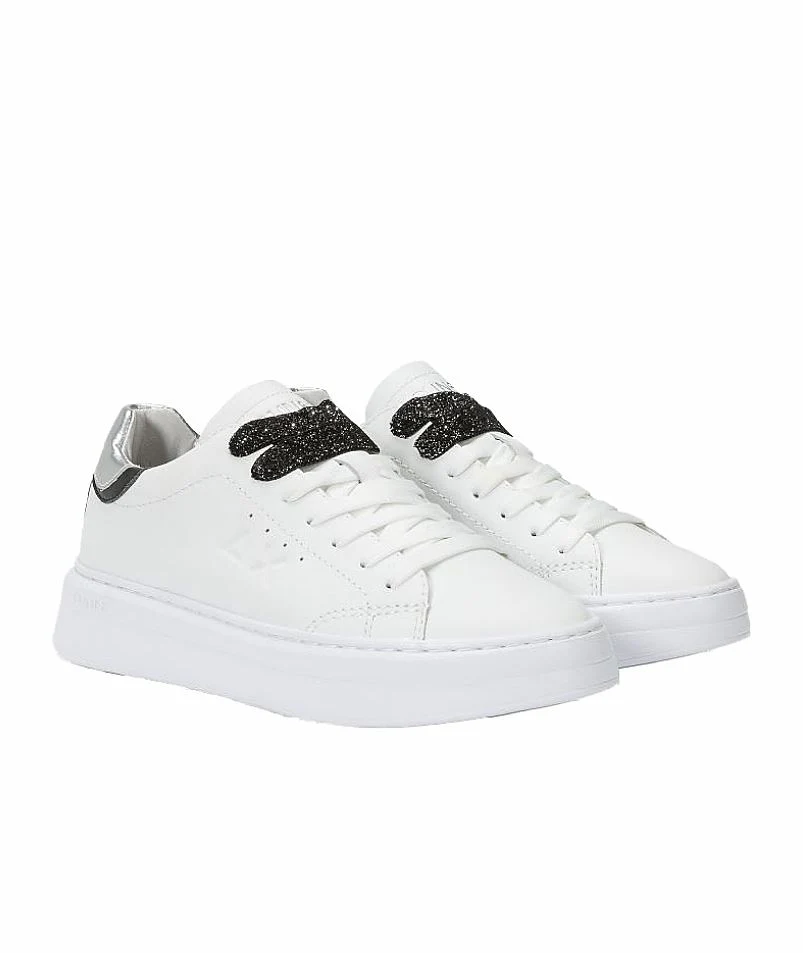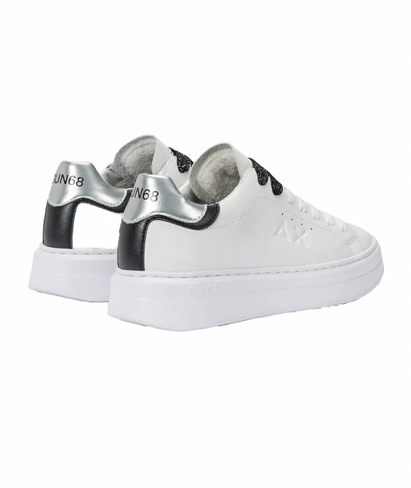 Scarpa ginnica di SUN68 Stile tennisRealizzata in vera pelle di colore biancoLogo SUN68 sullo spoiler color argentoChiusura con lacciDoppio laccio in dotazione, colore nero con lurex argentoSuola in gmma ultra leggera a cassettaSoletta estraibile alta 1,7 cmAltezza della suola: 3,5 cm Modello: GRACE Codice: Z44225 Colore: Bianco 0144 Composizione: 95% Pelle 5% Poliuretano
