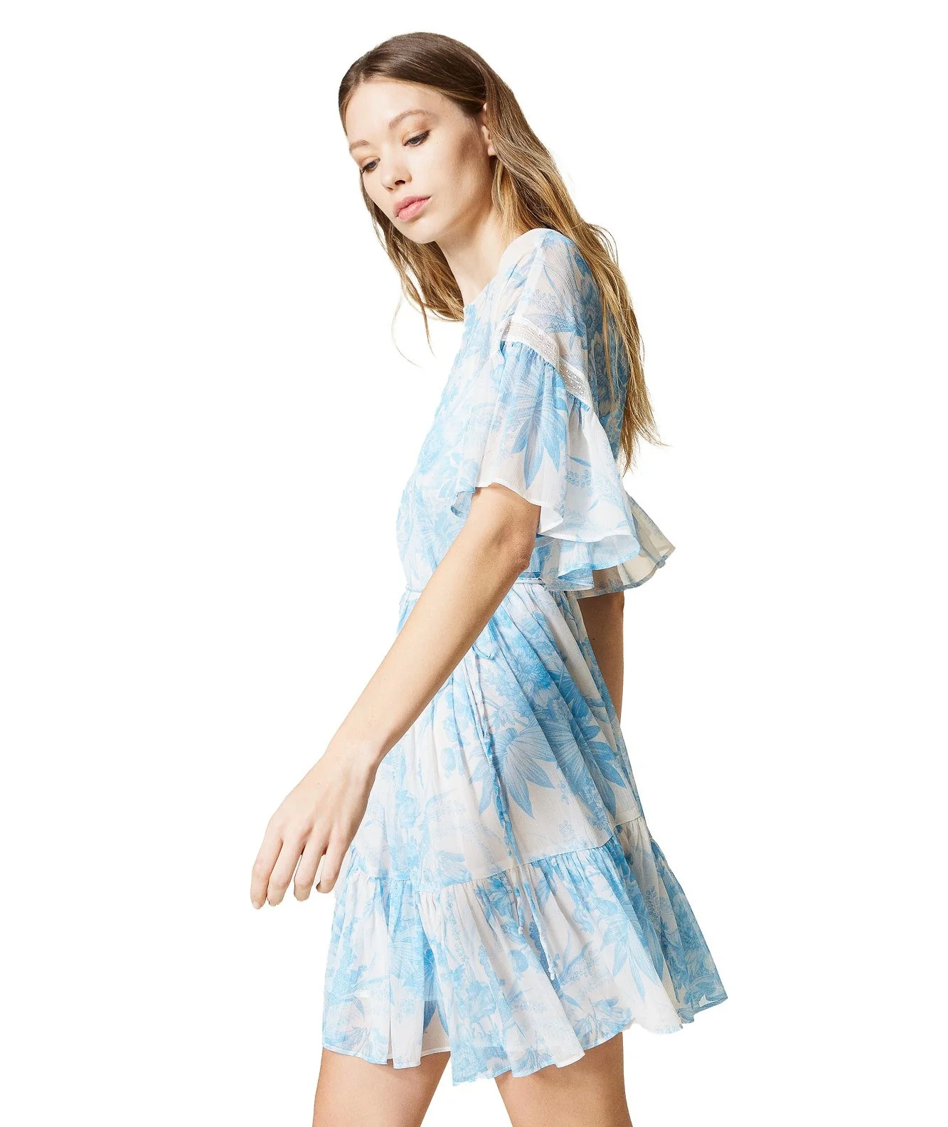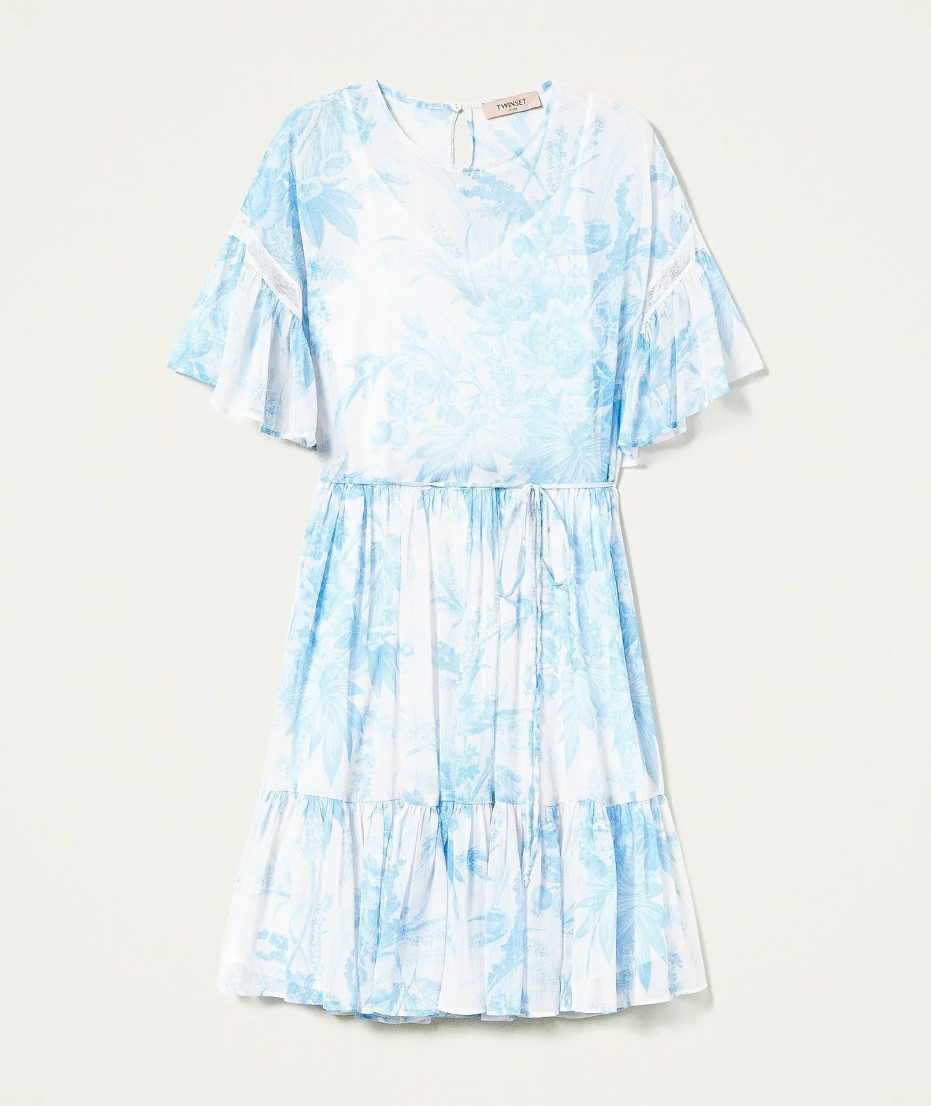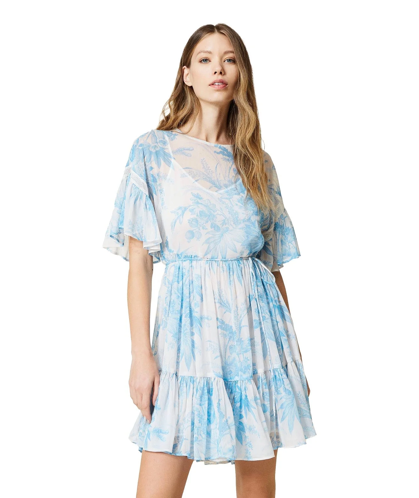 Abito corto in creponne leggero di Twinset con stampa floreale toile de Jouy, caratterizzato da maniche con volant e balza al fondo. Made in Italy. Codice: 221TP2712 Colore: AZZURRO