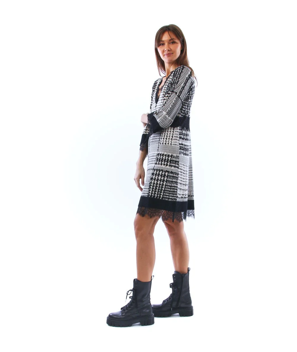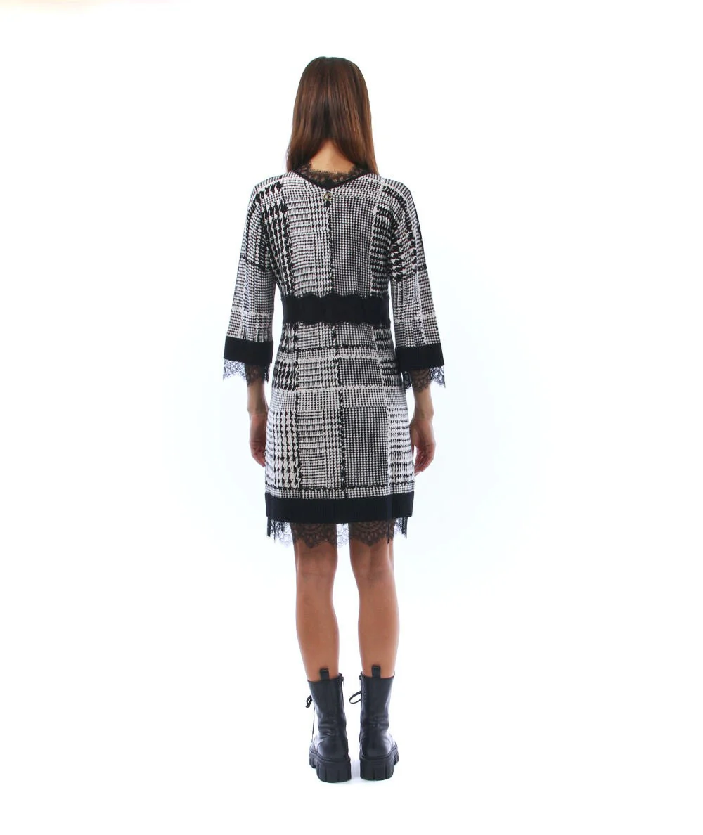 Abito corto in misto viscosa stampata di TWINSET con profili in pizzo smerlati con stampa quadri colore neve nero. Codice: 212TT3241/06563