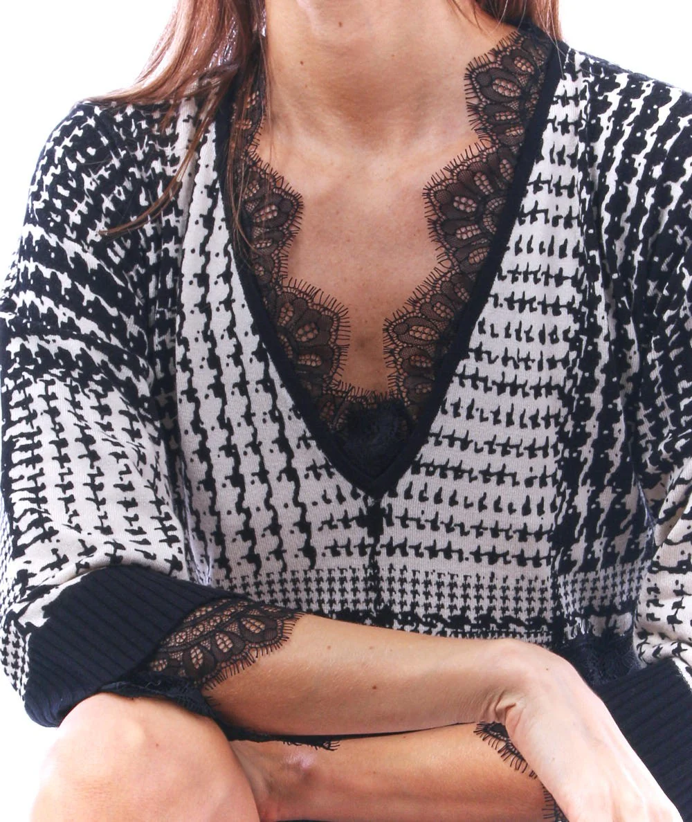 TWINSET ABITO CORTO DA DONNA IN MAGLIA STAMPATO PIZZO 212TT3241 NEVE NERO