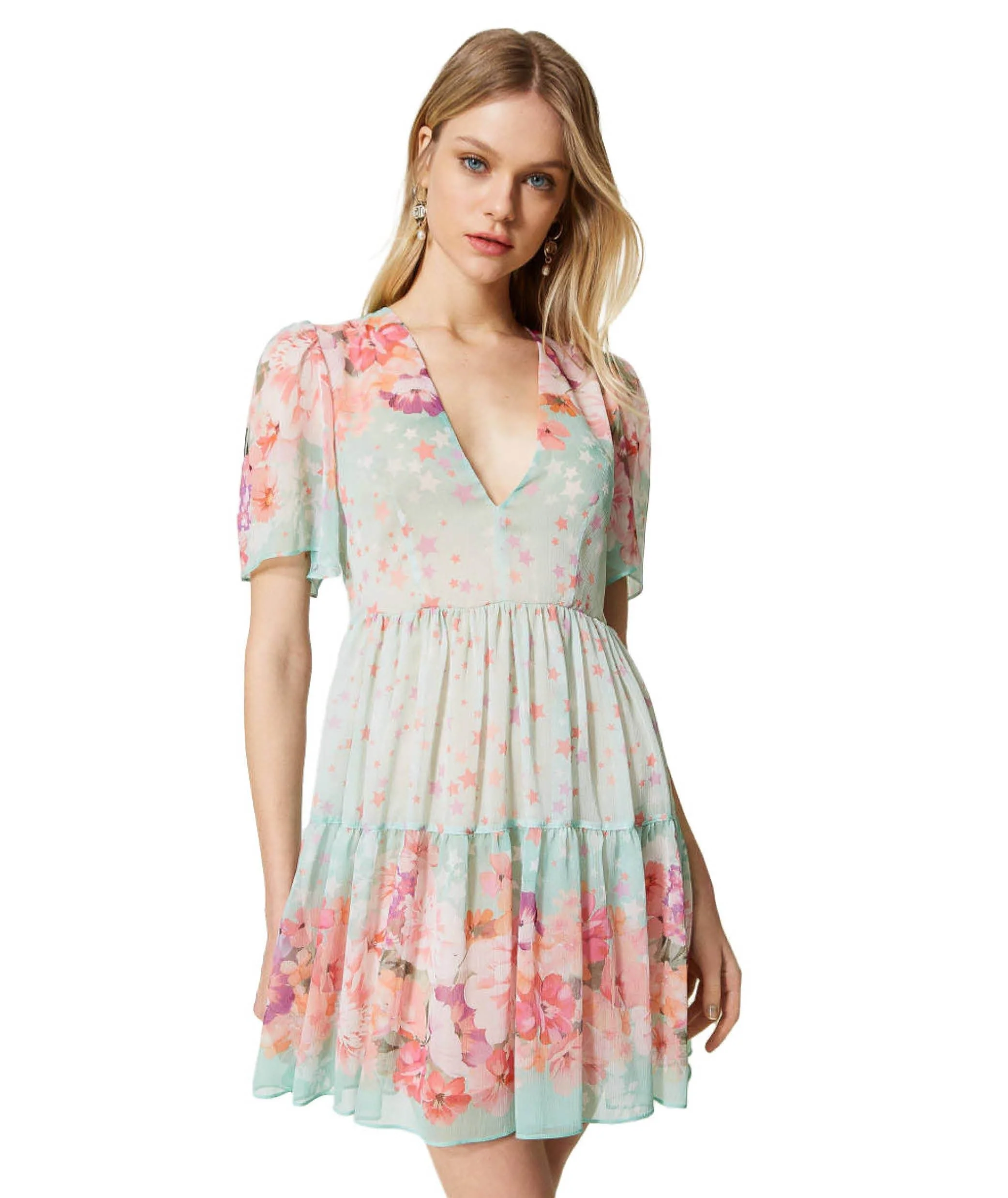TWINSET ABITO CORTO IN CREPONNE A FIORI E STELLE 231TP2732 ROSA AZALEA VERDE