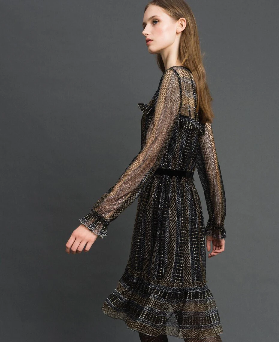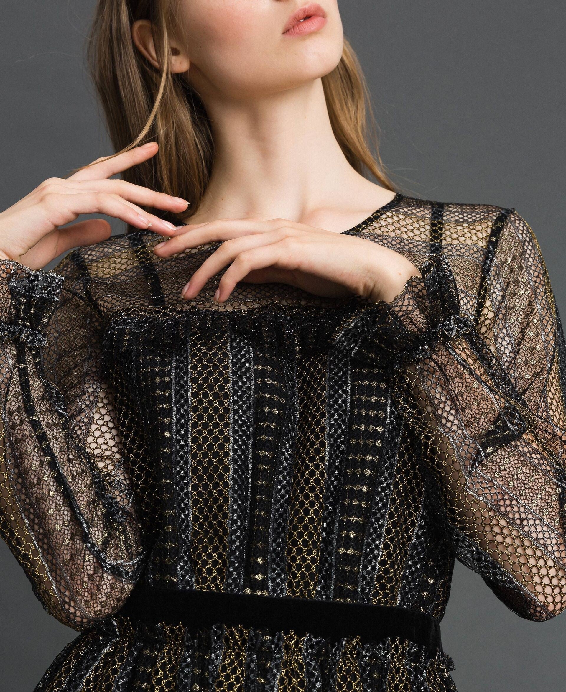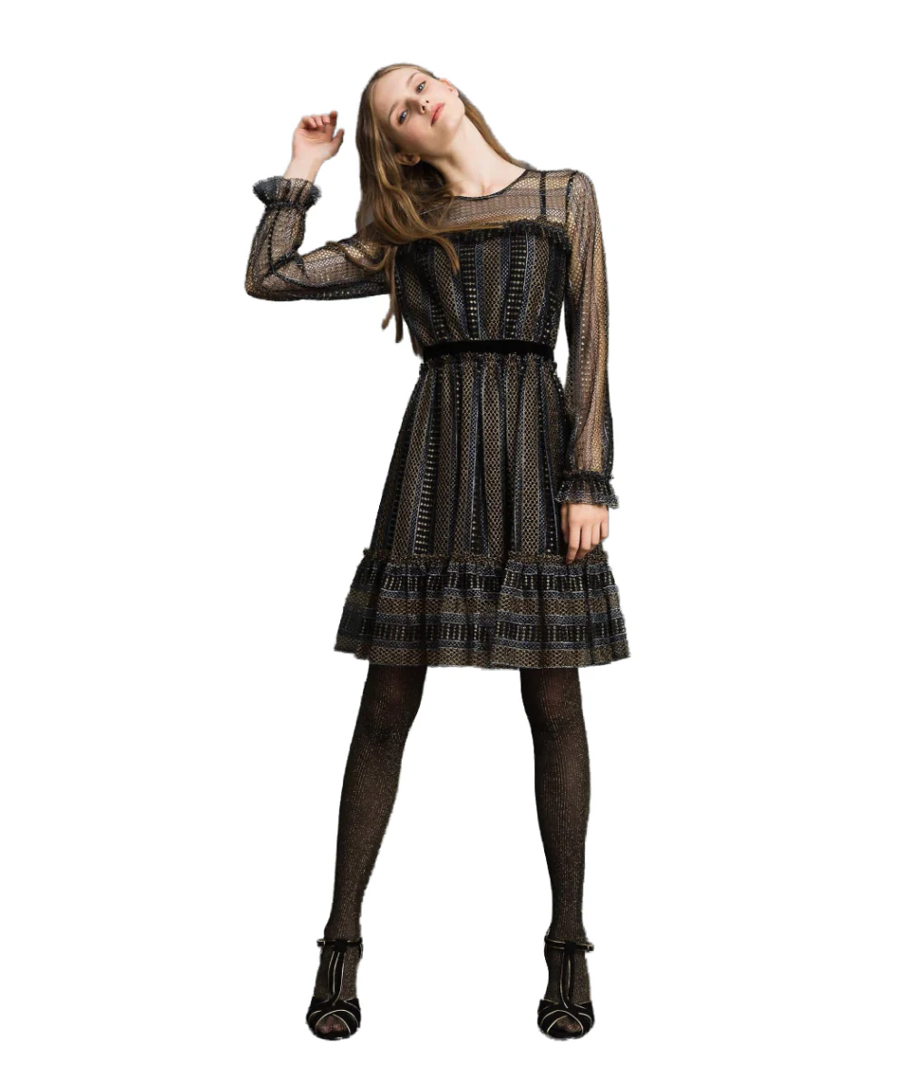 Abito corto di Twinset in pizzo lurex con dettaglio di velluto nero in vita, modello 192TT2363.